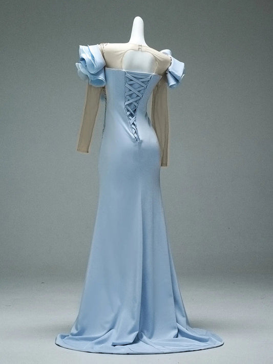 Light Blue Satin Sheath Formal Dresses with Beaded Bodice, Tiered Long Sleeve & Boat Neck - CQ0102