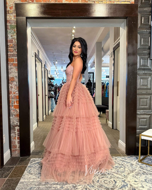 Robes de bal sans bretelles à volants roses robe de bal en dentelle appliquée FD3619