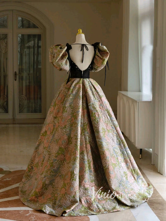 Robes de bal en Satin jacquard vert robe formelle à manches bouffantes FD3440B