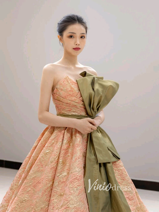 Robes de bal en Satin Jacquard pêche, robe de Quinceanera sans bretelles avec nœud papillon, FD3442