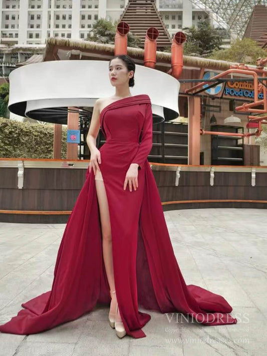 Robes de bal en satin rouge foncé à une épaule et manches longues avec fente FD2428