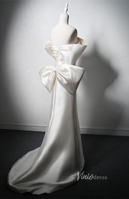 Ivory Smooth Satin Mermaid Prom Dresses with Removable Bow Tie Off the Shoulder AD1209