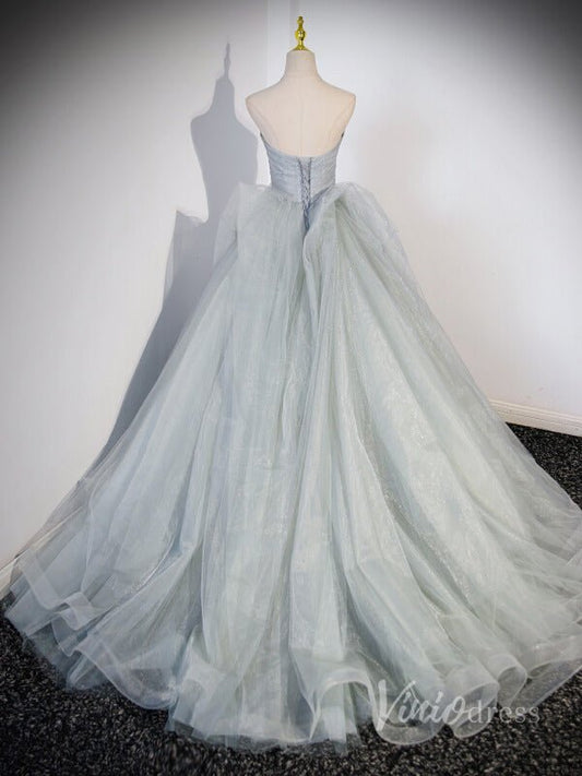 Sparkly Tulle Strapless Prom Dresses Pleated Bodice Beaded Bow 90041