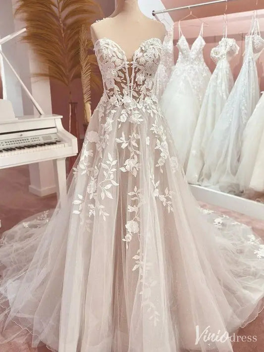 Ivory Floral Lace Strapless A-Line Wedding Dress with Sweetheart Neckline and Chapel Train – LA128