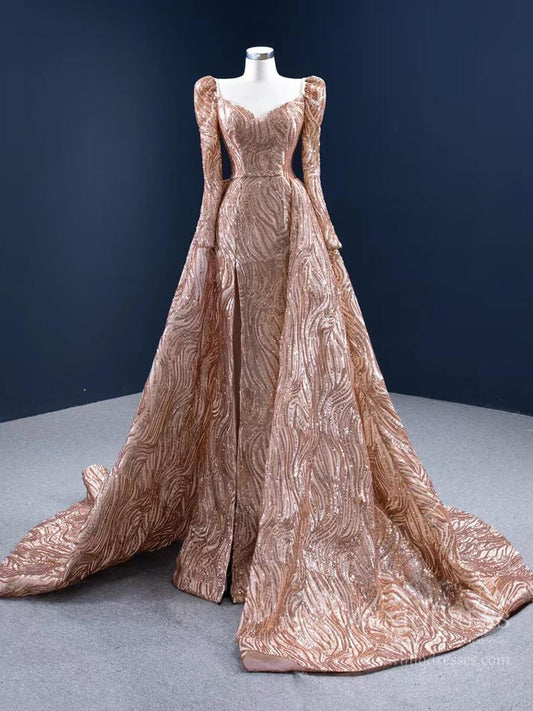Robe de bal dorée à manches longues, robe de bal de luxe à paillettes 67208 viniodress