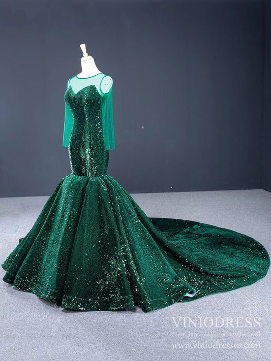 Robes de bal sirène à manches longues et paillettes vert émeraude FD1390B