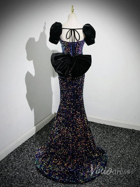 Sparkly Sequin Mermaid Prom Dresses Bow-Tie Puffed Sleeve Evening Dress 90053