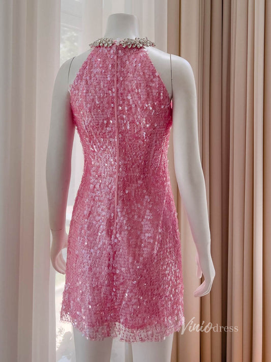 Robe de bal courte rose à paillettes et perles, col licou, moulante, FD4026