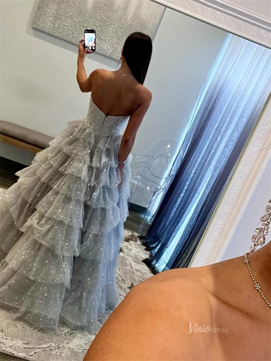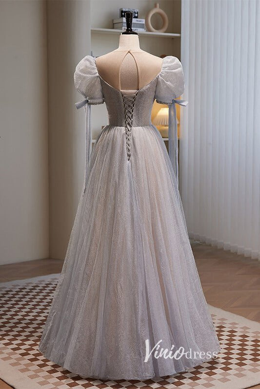 Robes de bal en tulle scintillant scintillant gris avec manches bouffantes FD3520