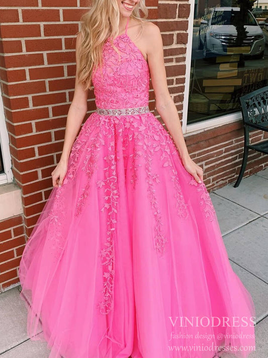 Robes de bal appliquées en dentelle rose vif licou taille perlée FD1265H