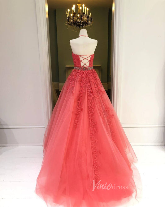 Robes de bal longues appliquées en dentelle licou rouge pastèque FD2018