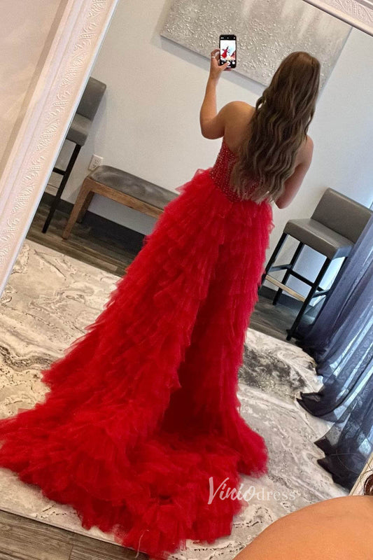 Robe de bal rouge à volants, sans bretelles, avec perles, robes formelles FD2950