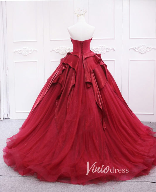 Robes de Quinceanera en Tulle plissé rouge, robe de bal sans bretelles, FD3452