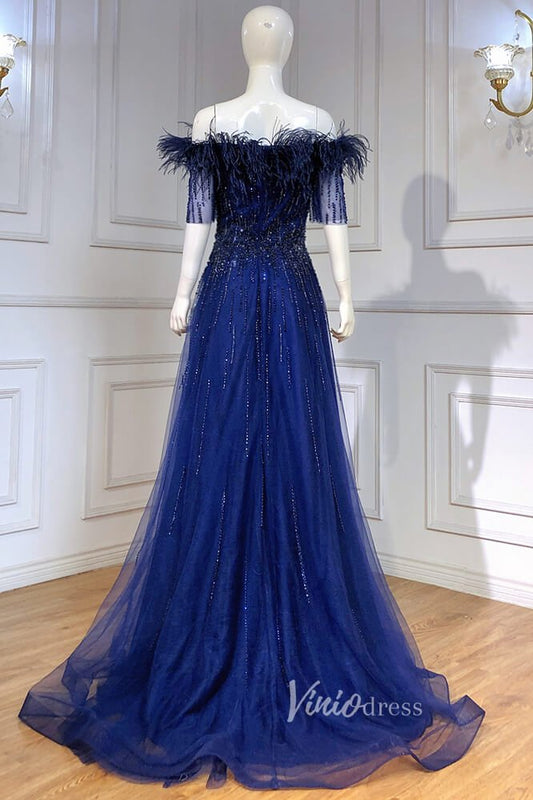 Robes de soirée en plumes perlées bleu Royal, robe de bal à manches courtes, FD3007