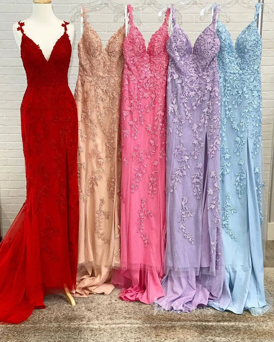 Spaghetti Strap Satin Prom Dresses with Slit, Lace Appliqued Sheath Formal Dresses FD1523B