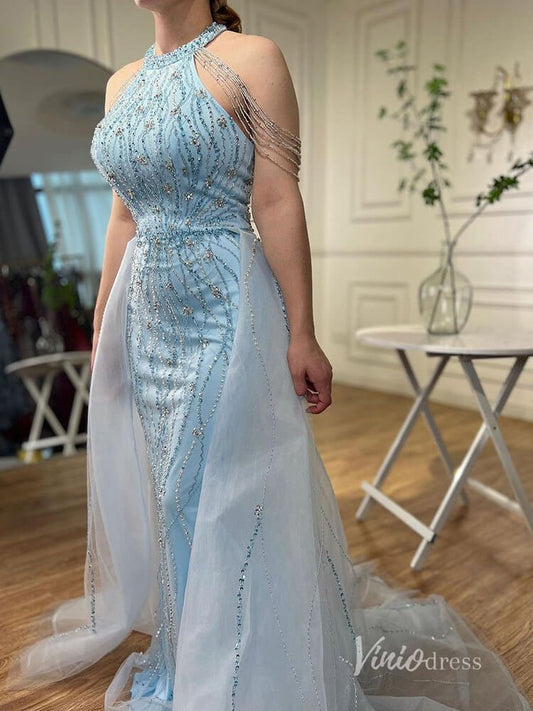 Robe de soirée sirène perlée bleu poussiéreux, avec jupe, col licou, robe de concours, AD1144