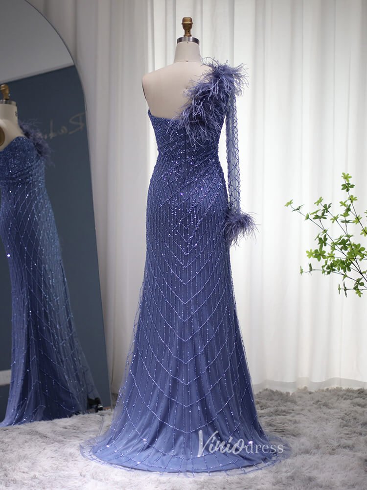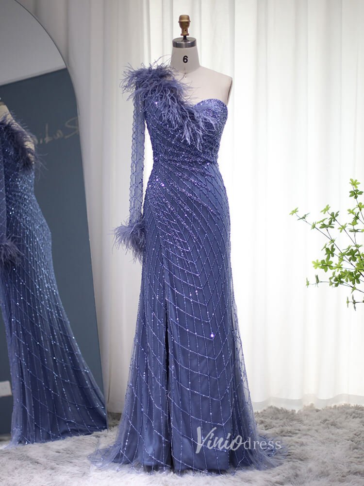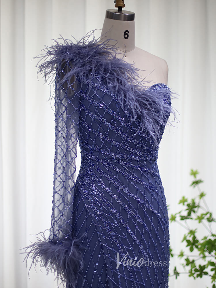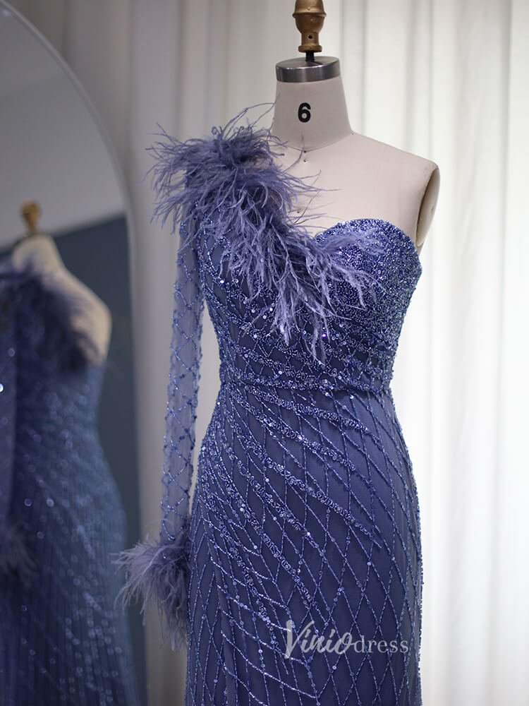 Robes de bal bleu marine perlées une épaule plume robe de soirée à manches longues 2008