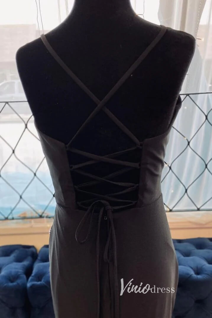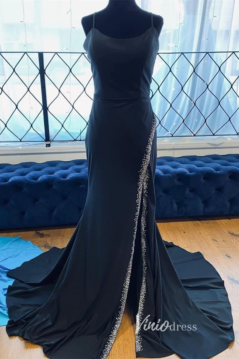Robes de bal en satin noir avec robe formelle fendue sirène à bretelles spaghetti FD3289