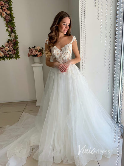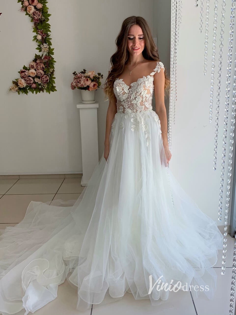 Robe de mariée trapèze en tulle avec corsage appliqué en dentelle.