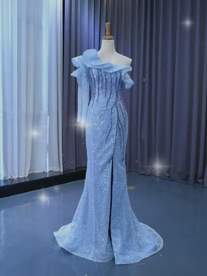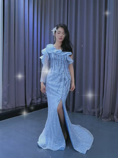 Robe de concours bleu poussiéreux une épaule à manches longues sirène robes de soirée formelles 222185