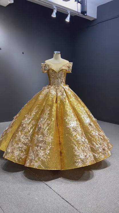 Robe de bal à paillettes dorées, fleurs 3D, robes de Quinceañera, 66536C, épaule transparente
