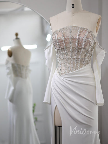 Ivory Beaded Mermaid Prom Dresses with Slit Off the Shoulder Pageant Dress AD1188
