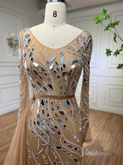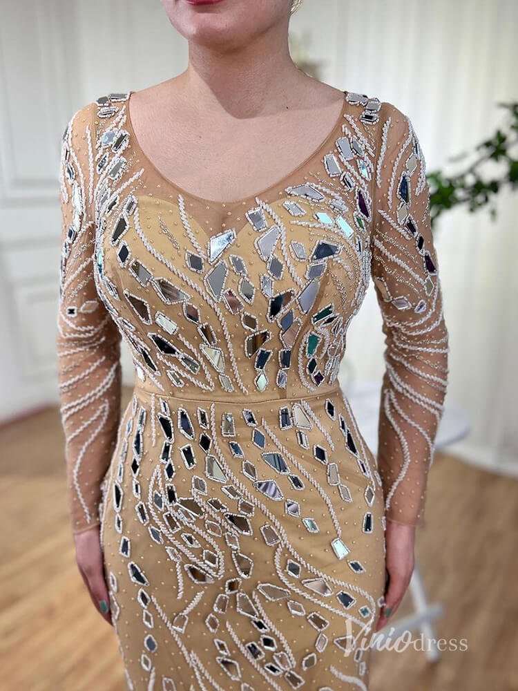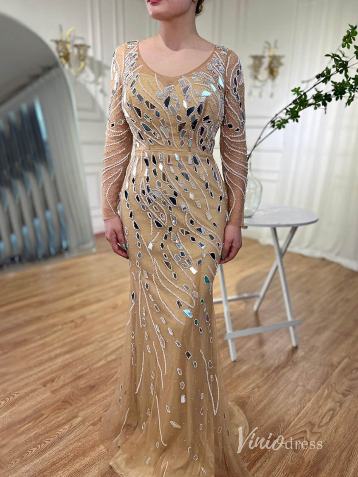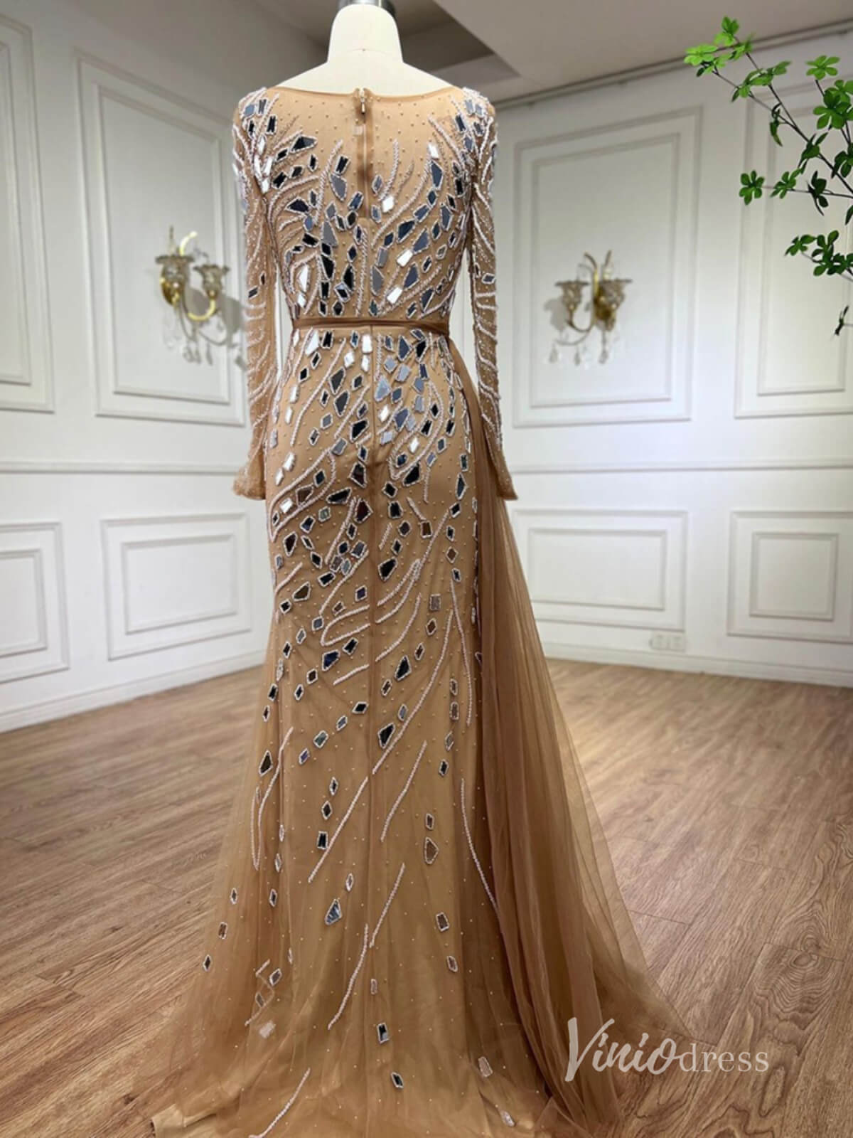 Kaki perlé à manches longues robes de soirée sirène robe formelle AD1142