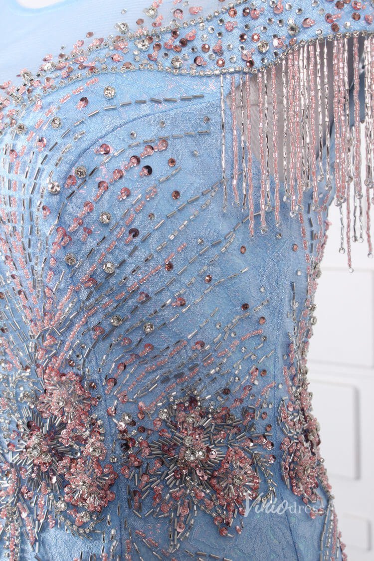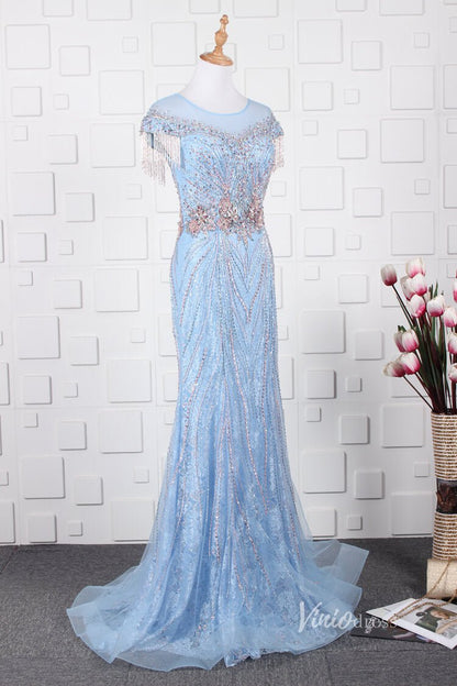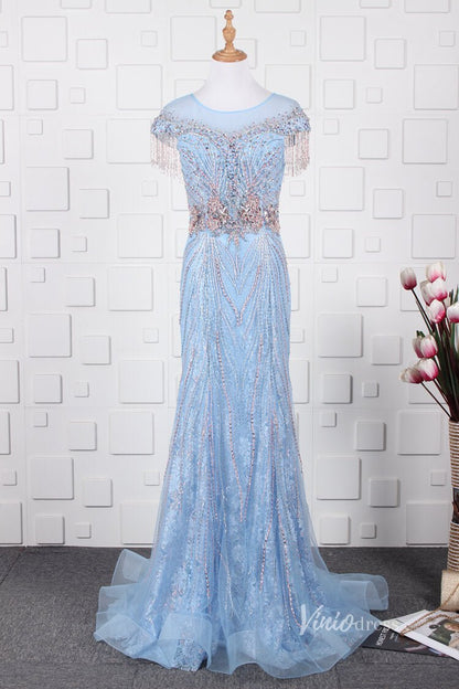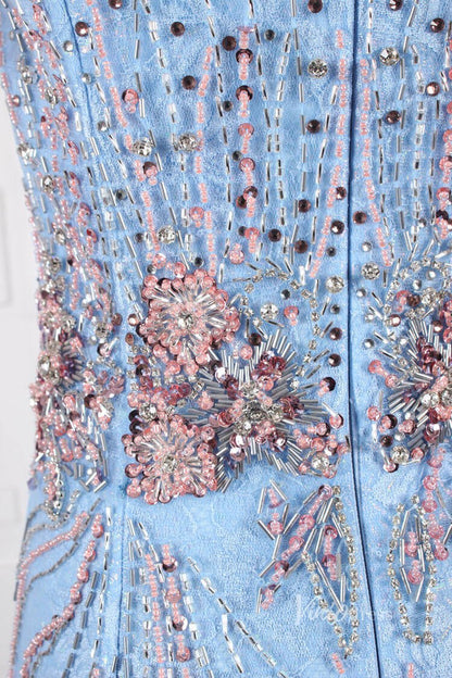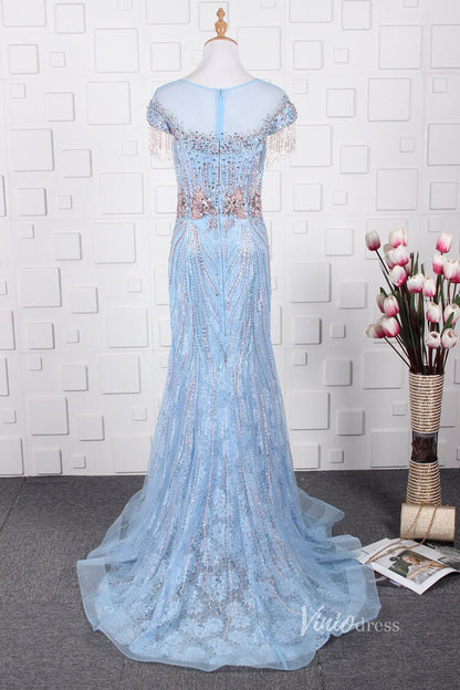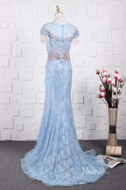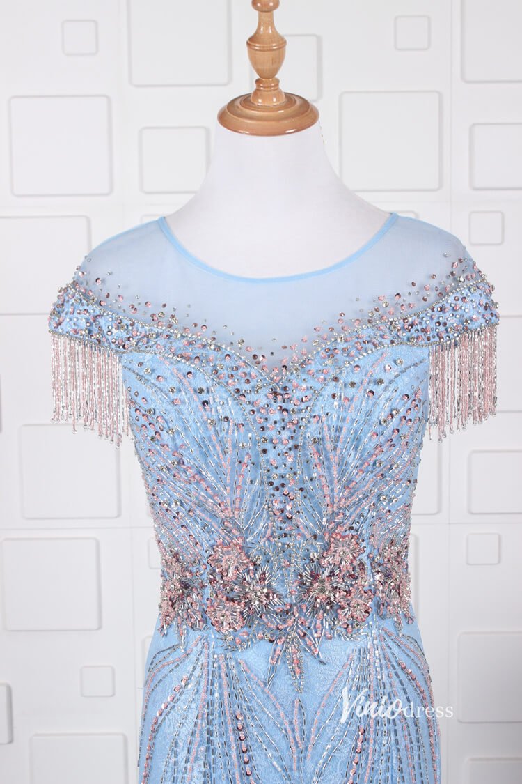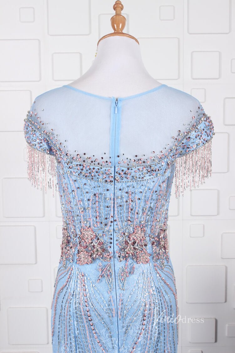 Robe de soirée fourreau en dentelle bleu clair perlée, tenue de soirée Vintage, FD2670