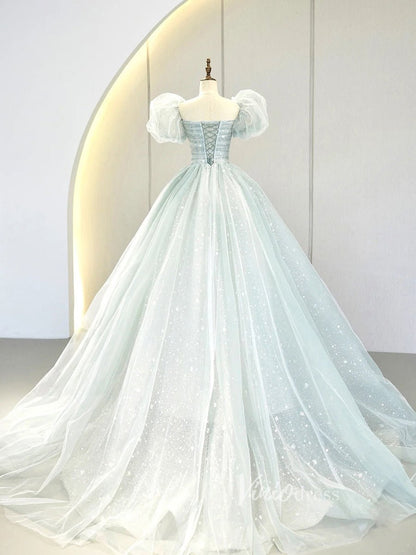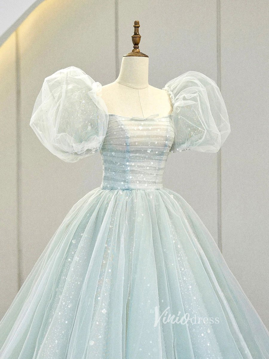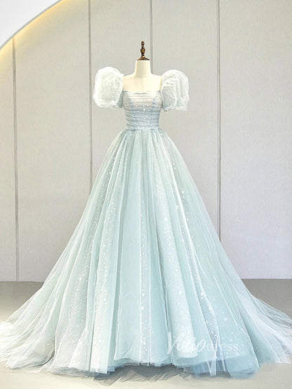 Robes de bal en tulle scintillant bleu clair, robe de bal à manches bouffantes FD3213