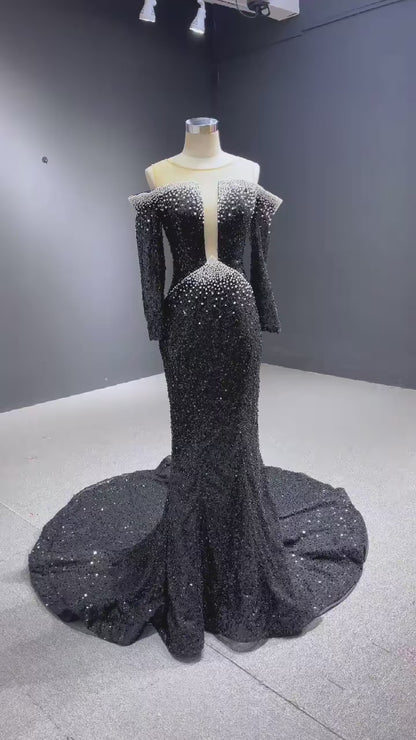 Robes de mariée noires à manches longues, robe de concours perlée 222186