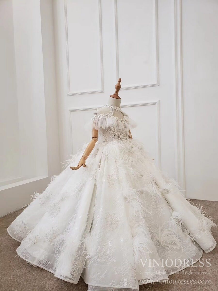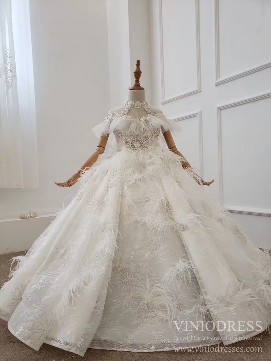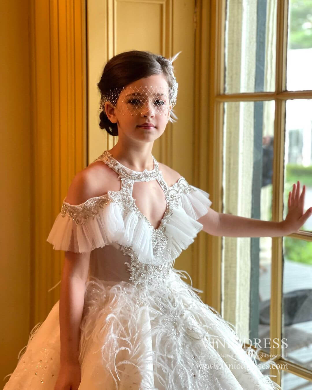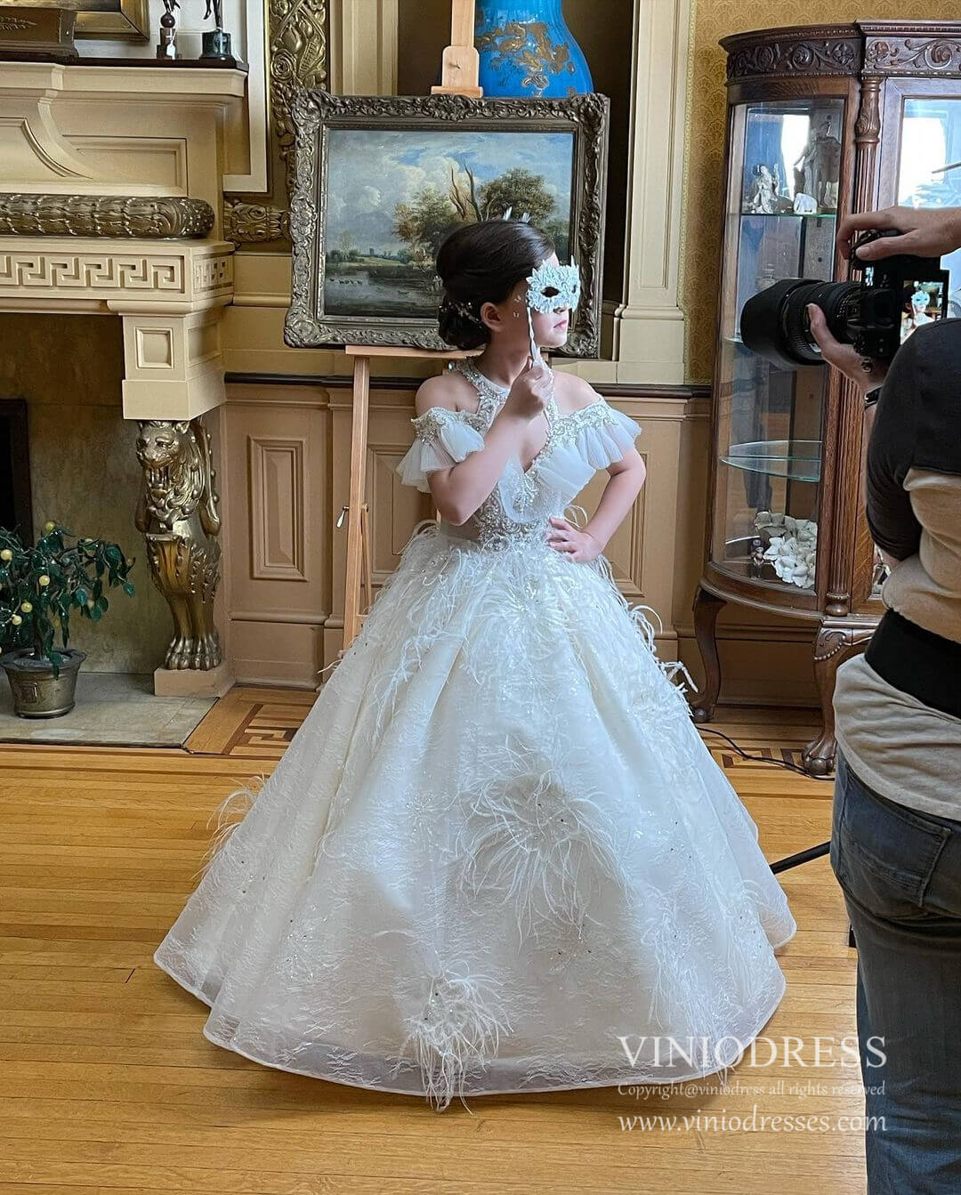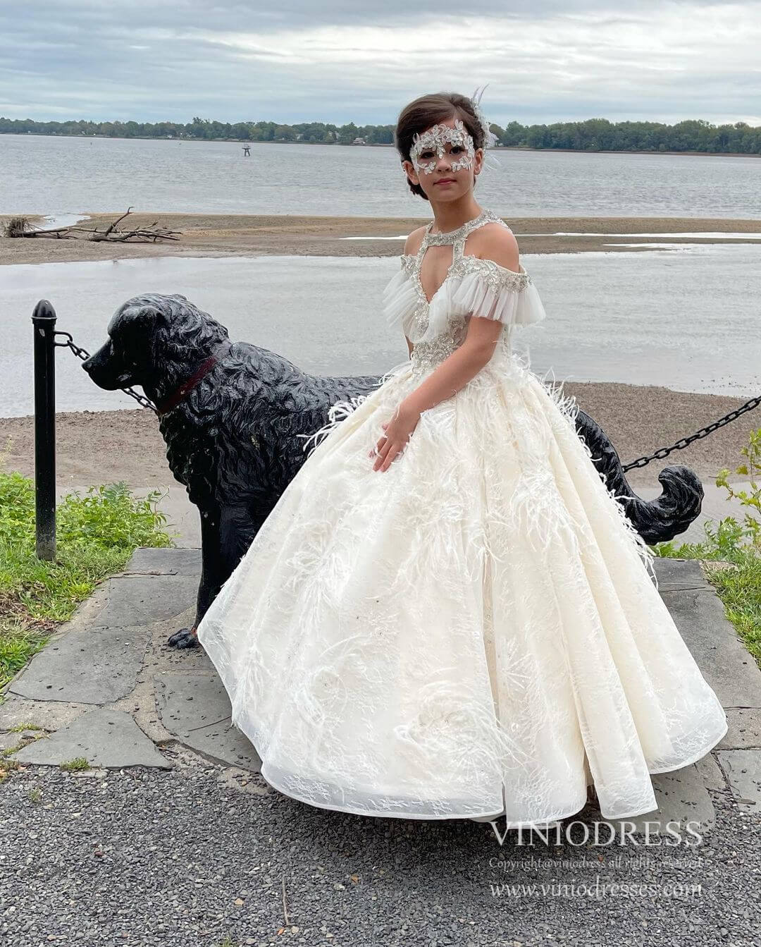 Robes de bal de luxe en dentelle de plumes pour petites filles KD1030