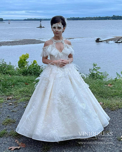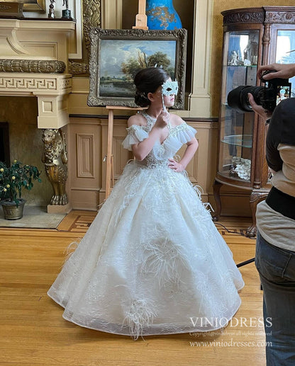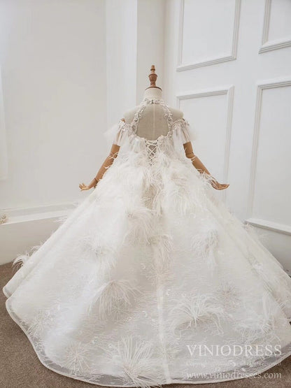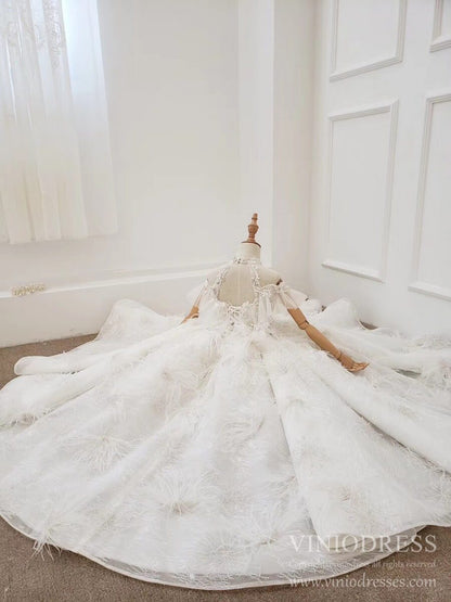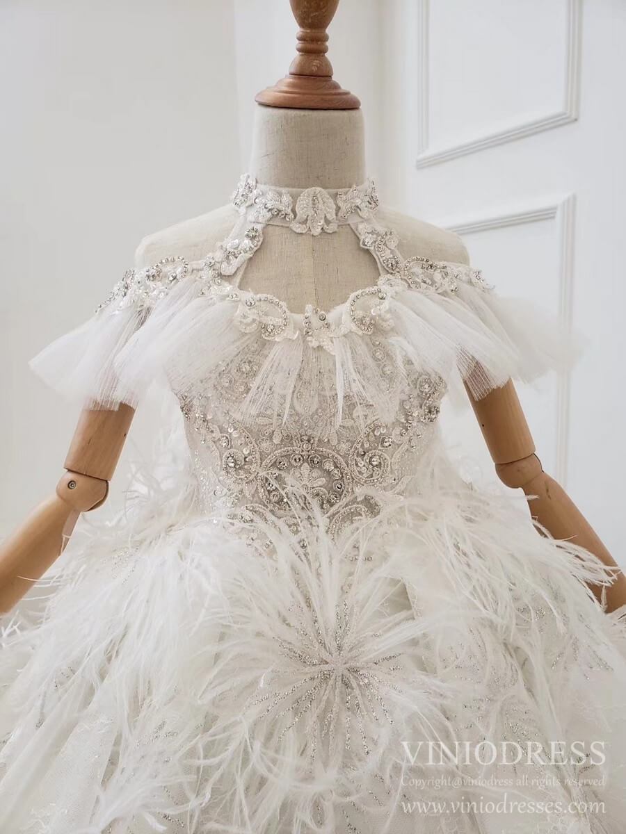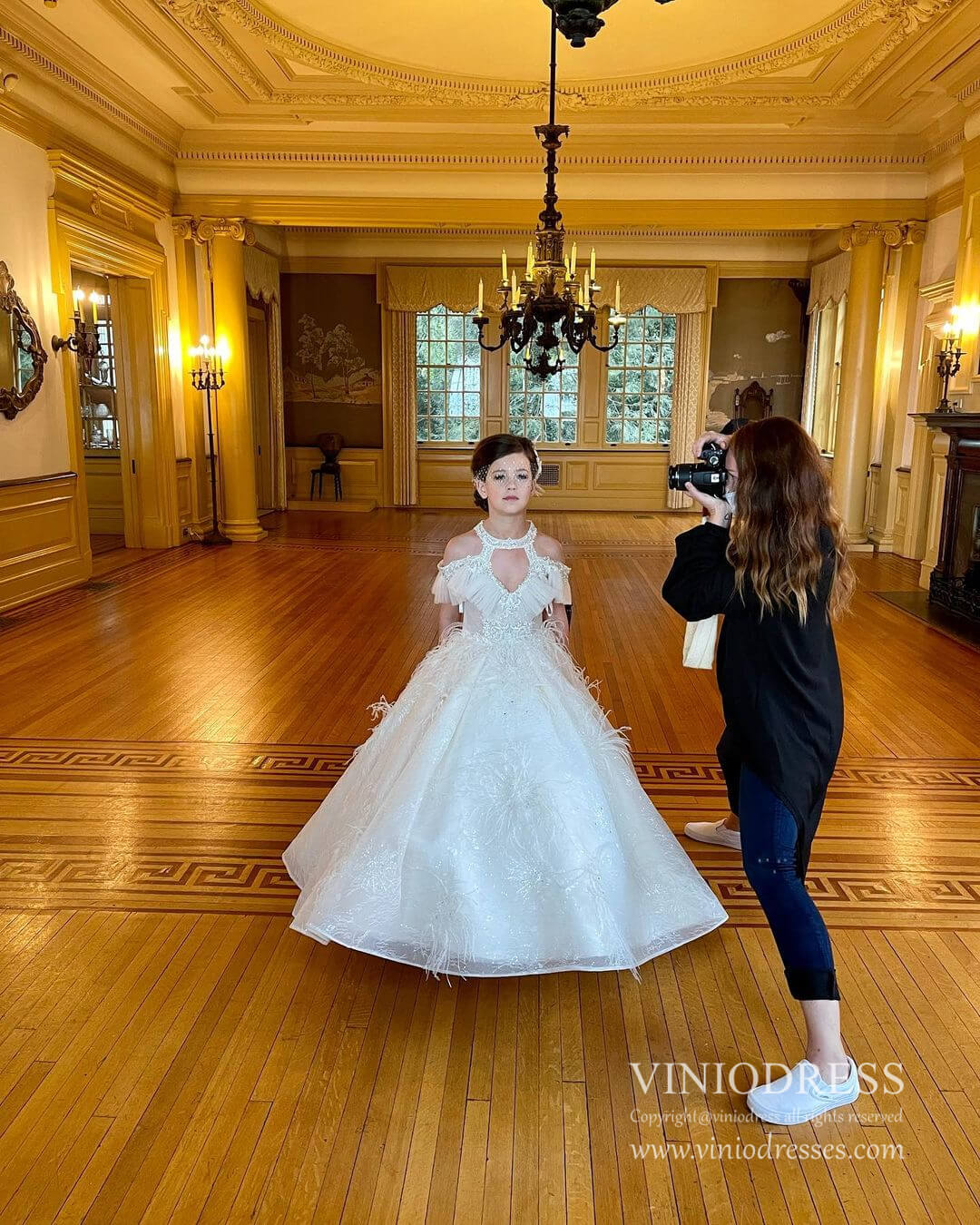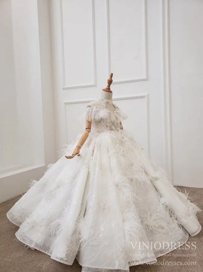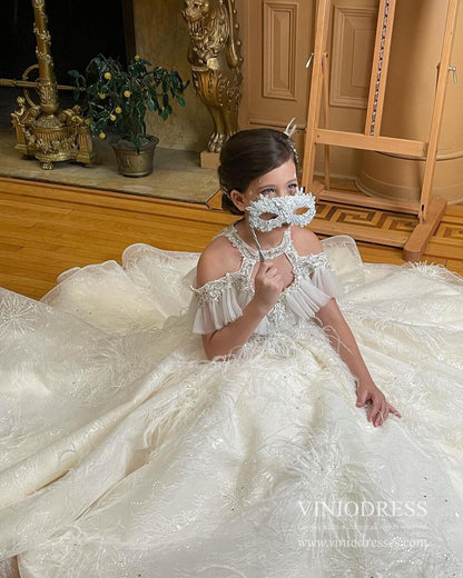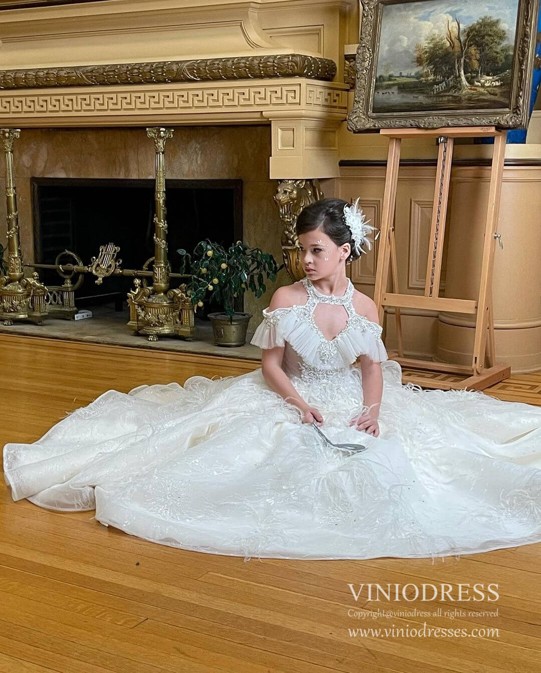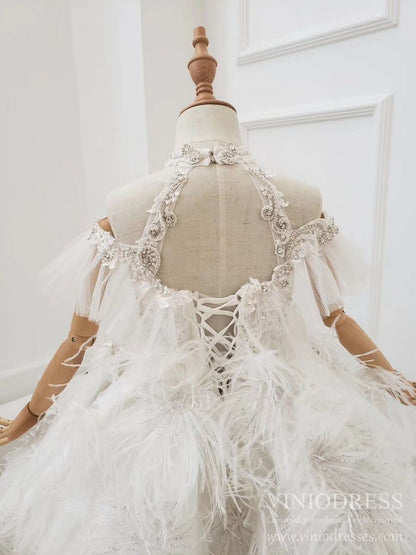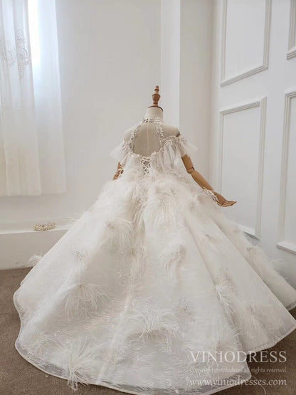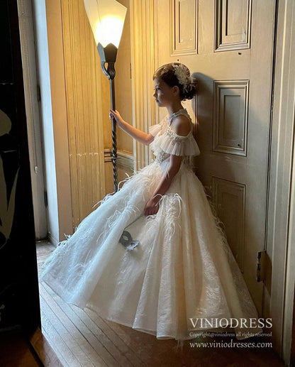 Robes de bal de luxe en dentelle de plumes pour petites filles KD1030