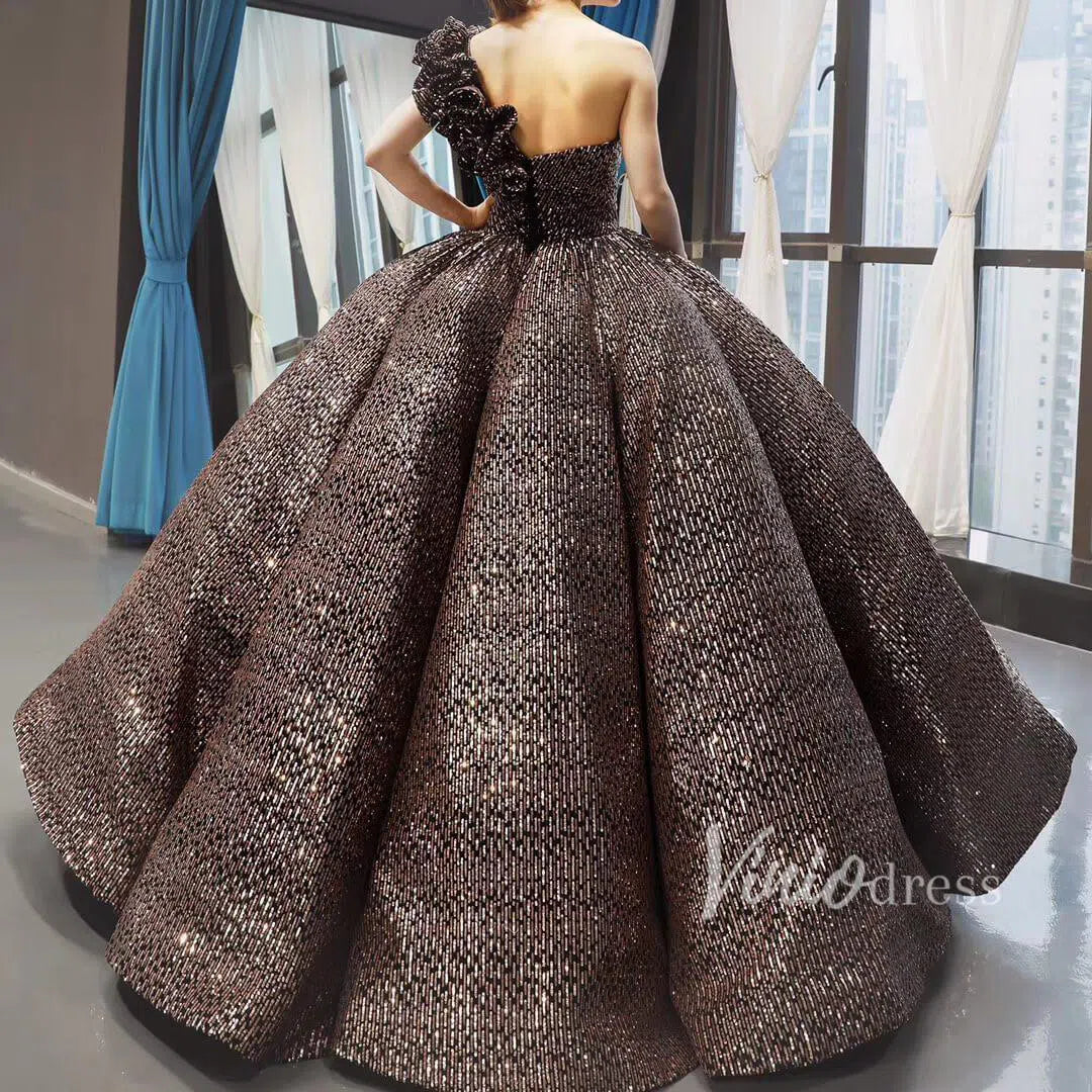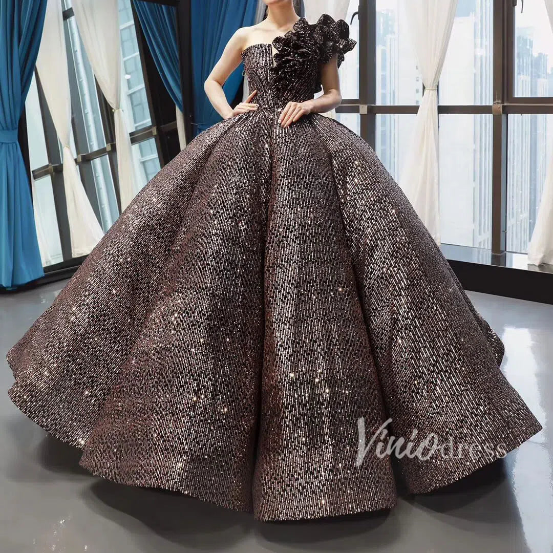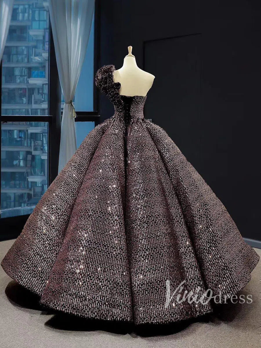 Robe de Quinceañera noire à une épaule, robe de bal scintillante, robe de bal FD1281 viniodress