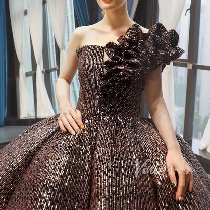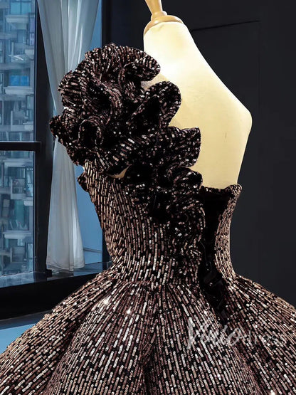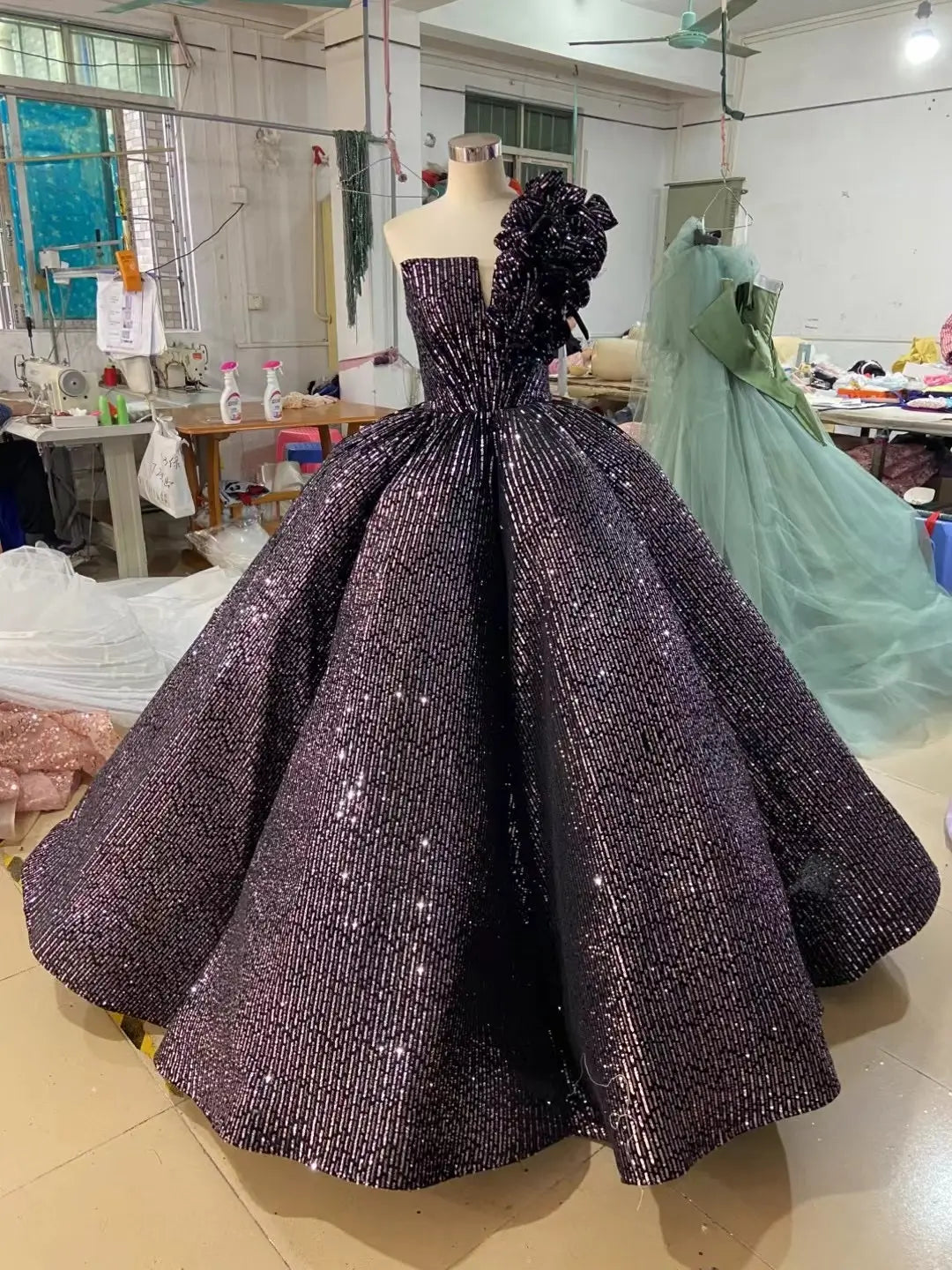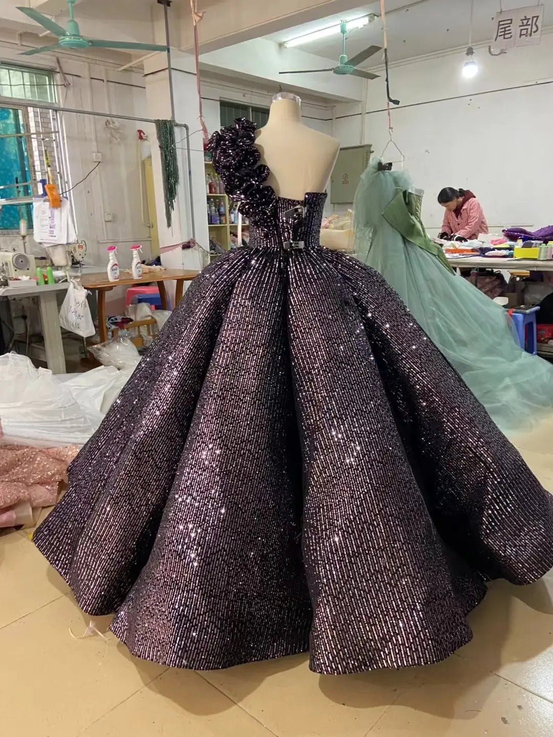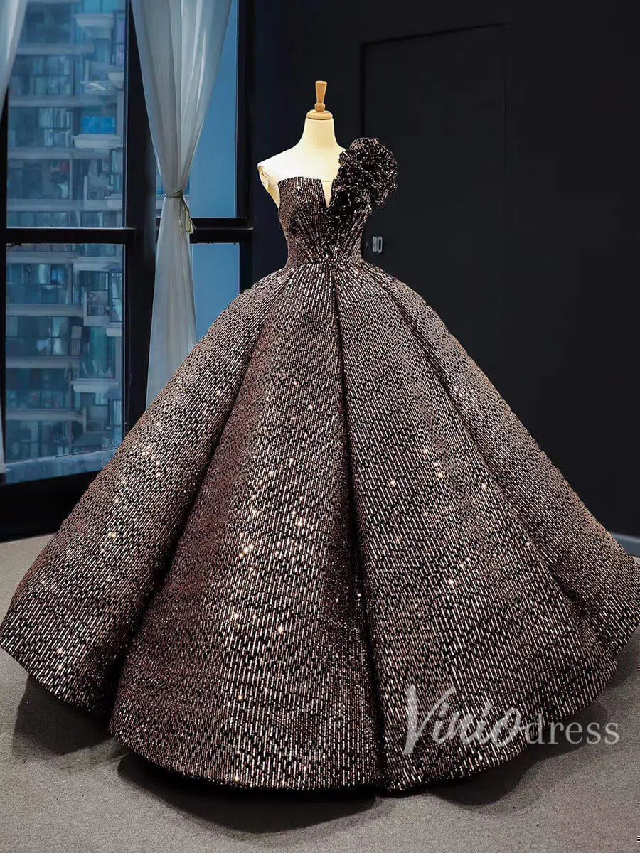 Robe de Quinceañera noire à une épaule, robe de bal scintillante, robe de bal FD1281 viniodress