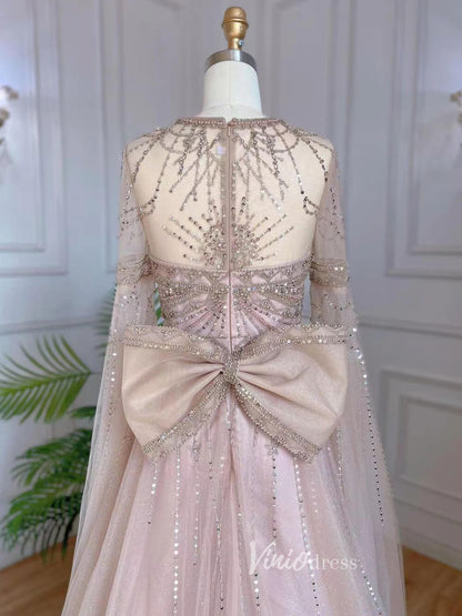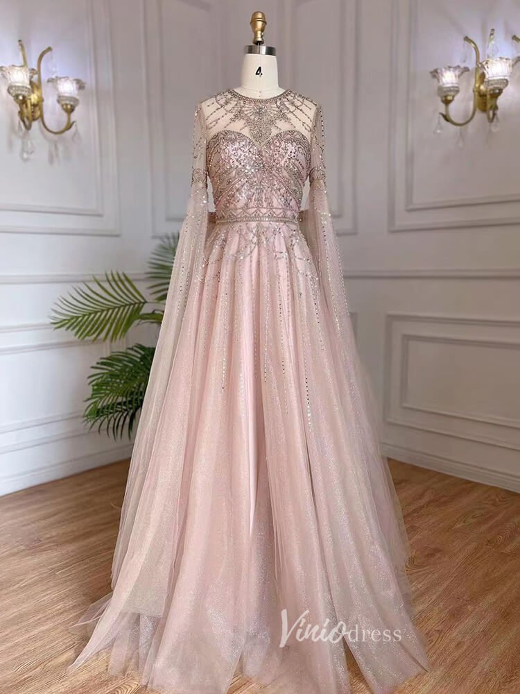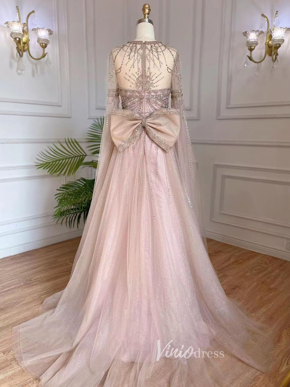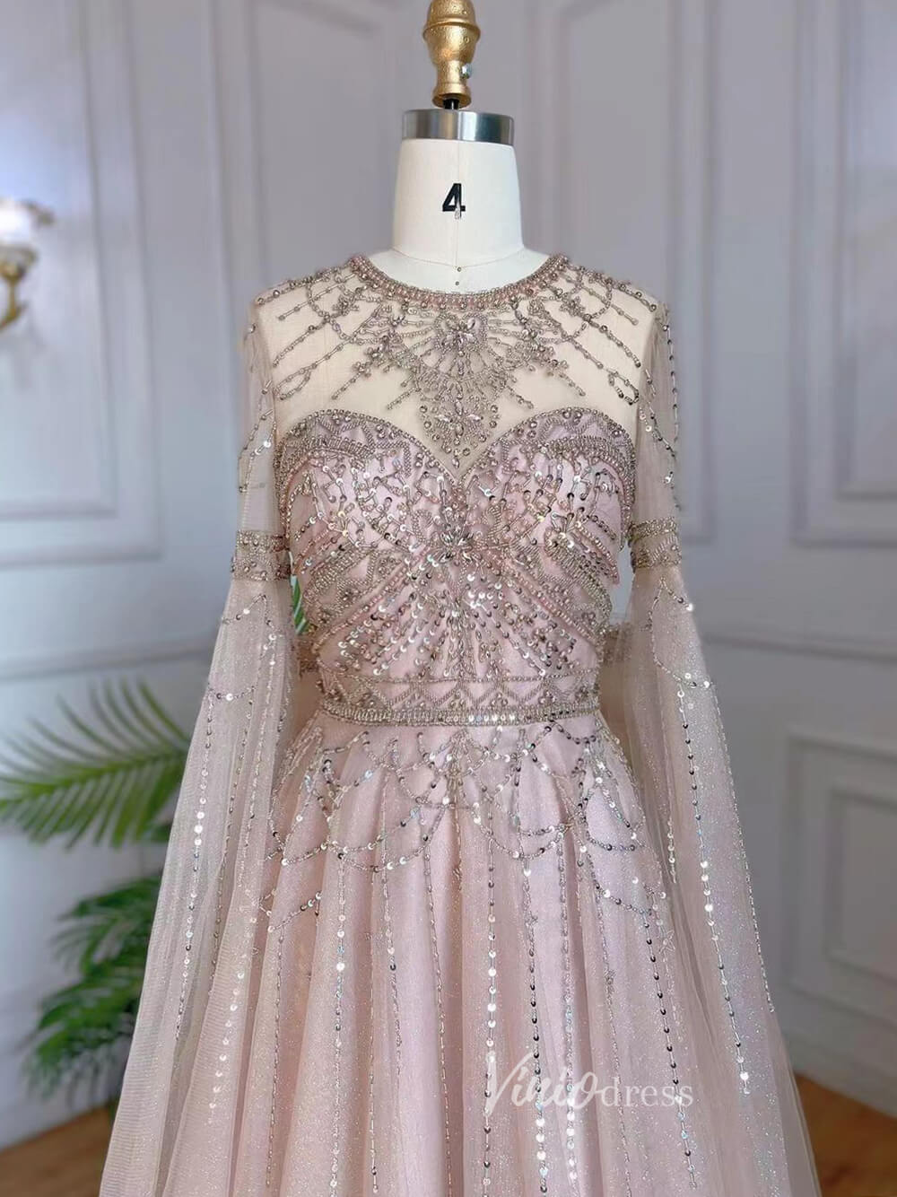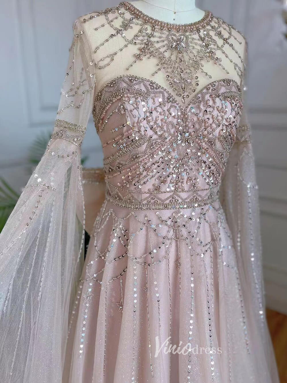 Robe de bal trapèze perlée rose, robe de soirée à manches extra longues, 20068