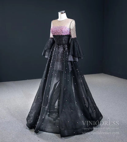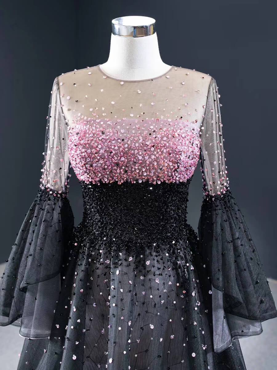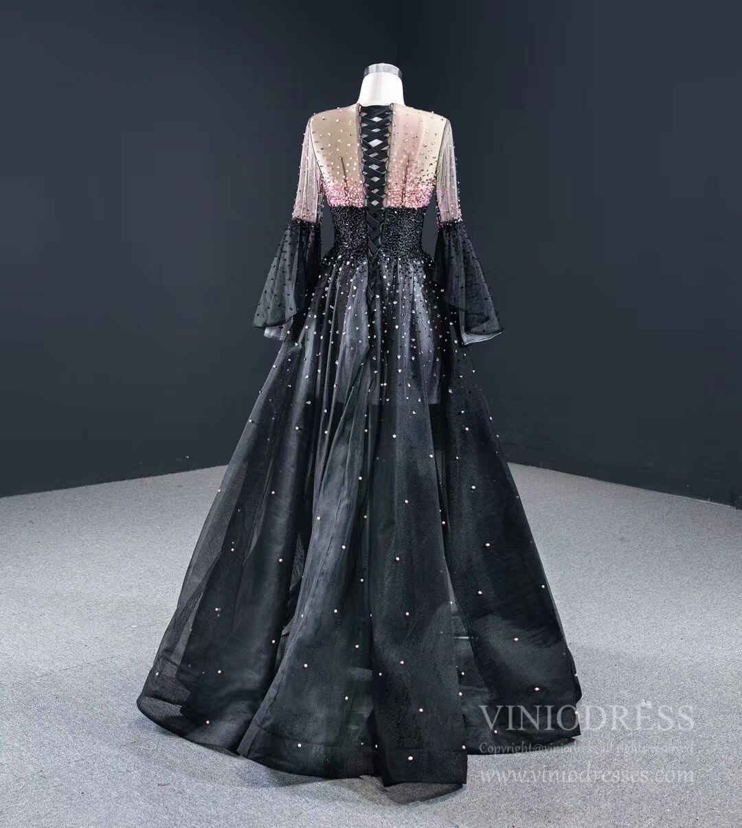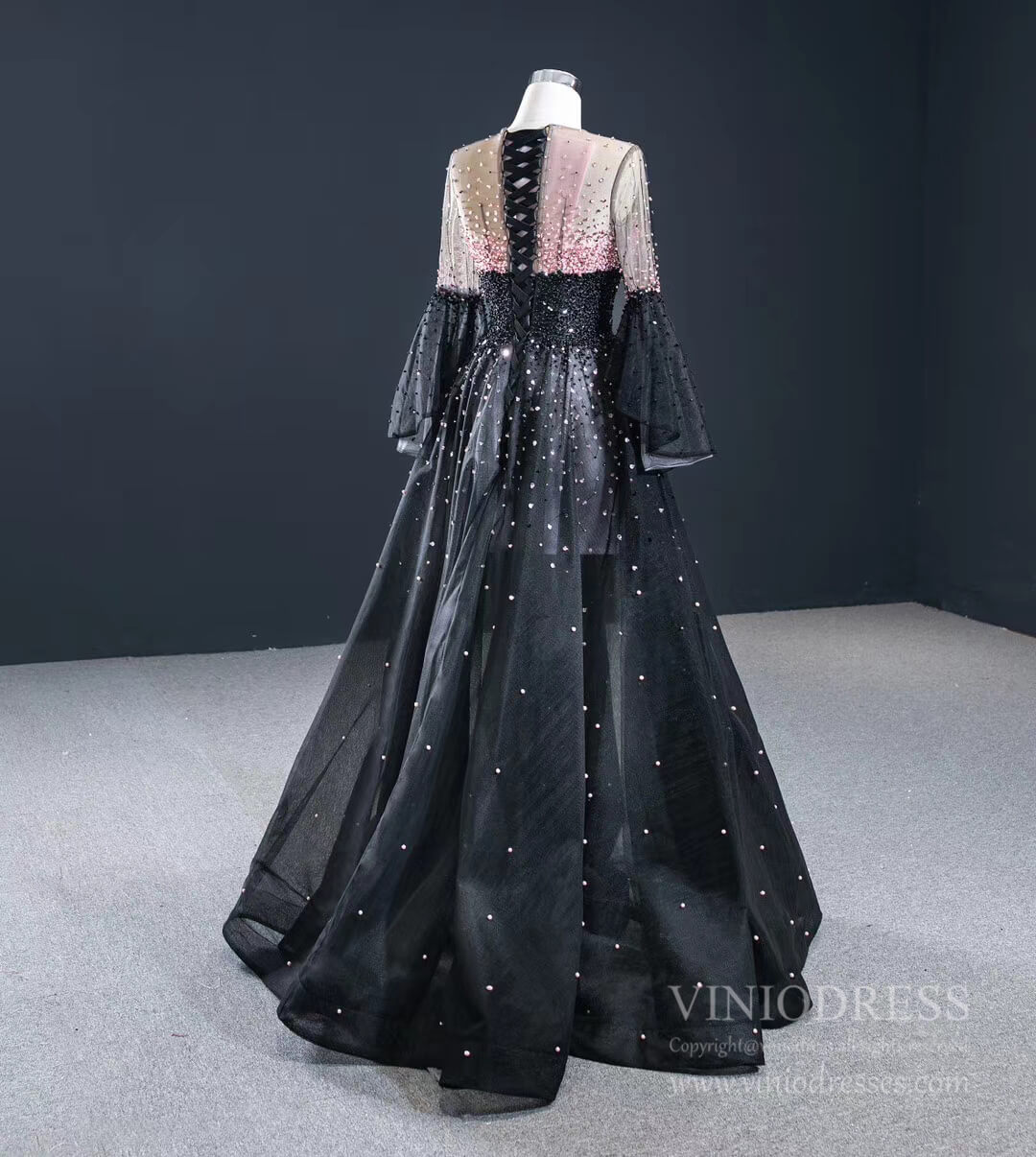 Robes de bal noires sexy manches évasées robe formelle rose perlée FD2440 viniodress