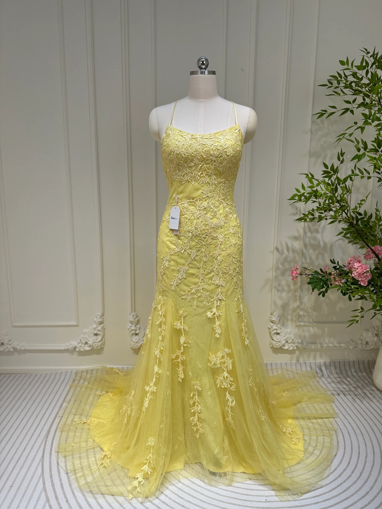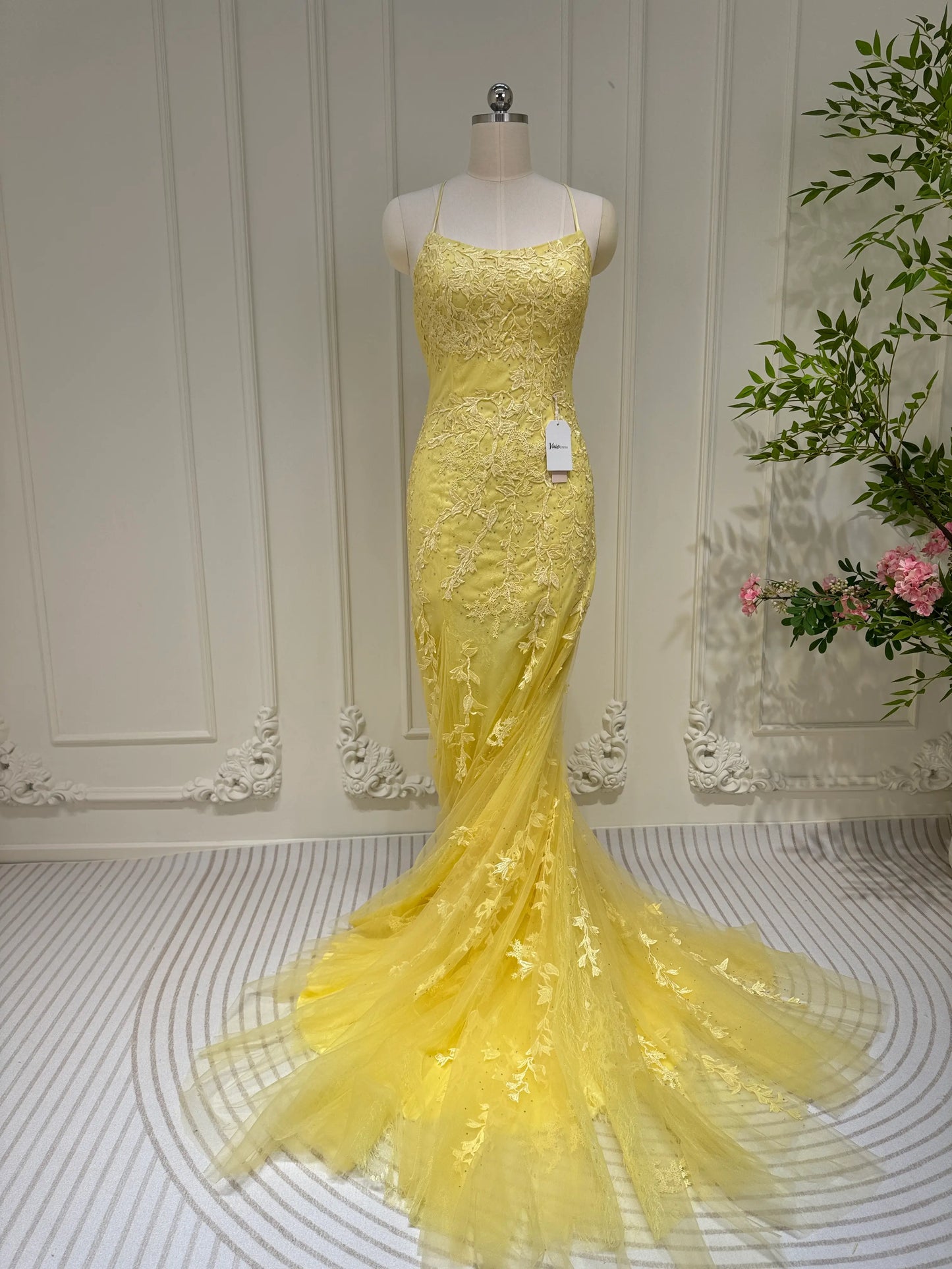 Cette robe de bal sirène classique présente des appliques de dentelle intemporelles, un dos à lacets à bretelles spaghetti, une jupe sirène moulante et une traîne en tulle aérée. Disponible dans une variété de couleurs, ce design intemporel vous assure d'avoir l'air sophistiqué et de vous sentir belle pour votre occasion spéciale.