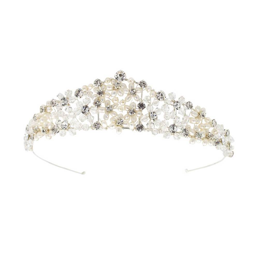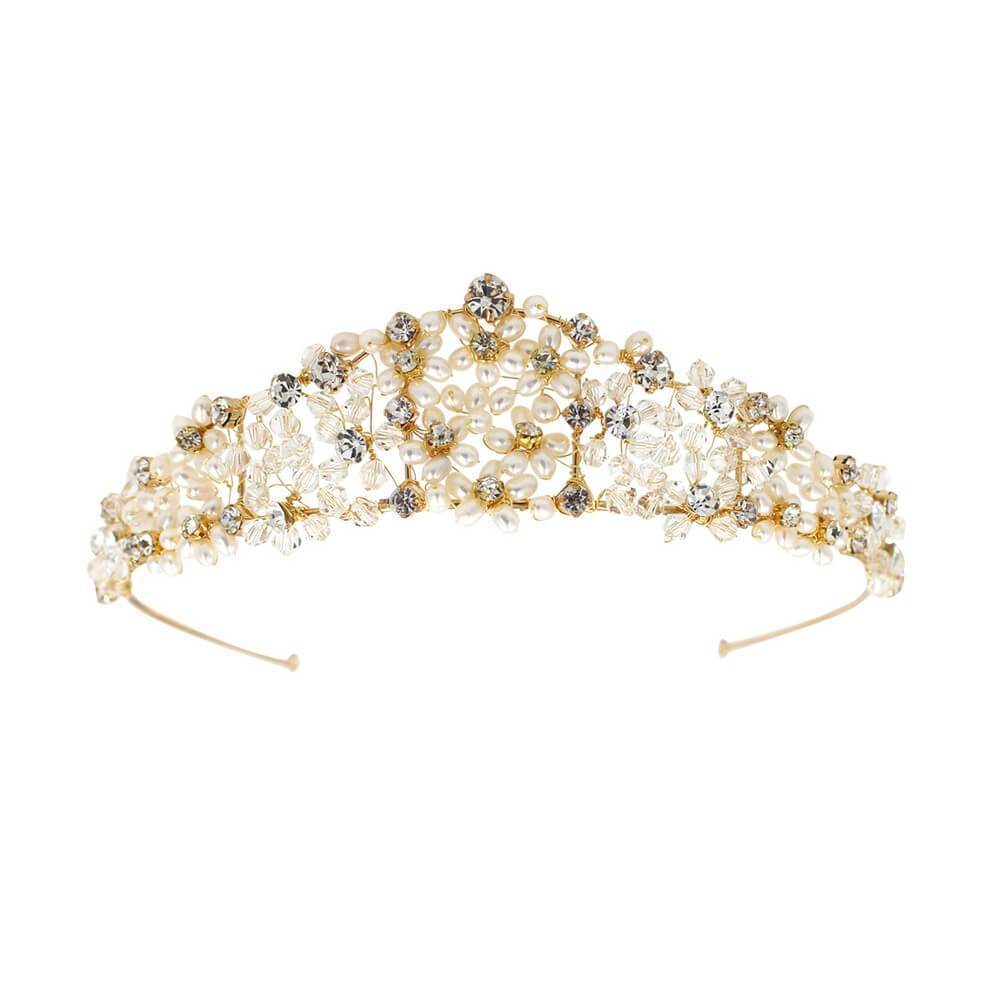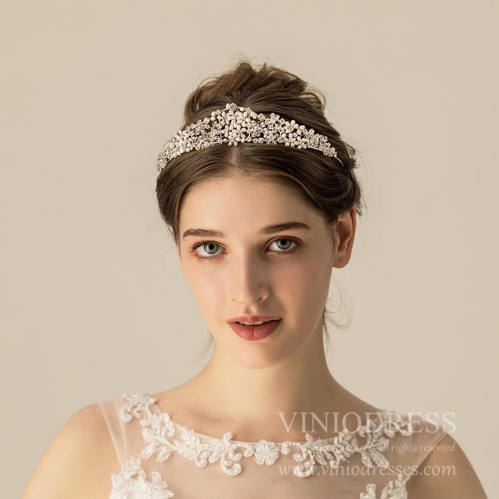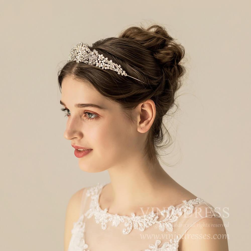 Ce diadème de mariage simple est câblé à la main avec des perles d'eau douce et des pierres de cristal rondes.