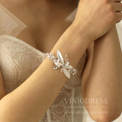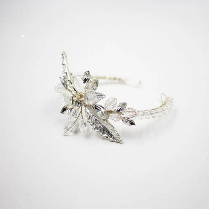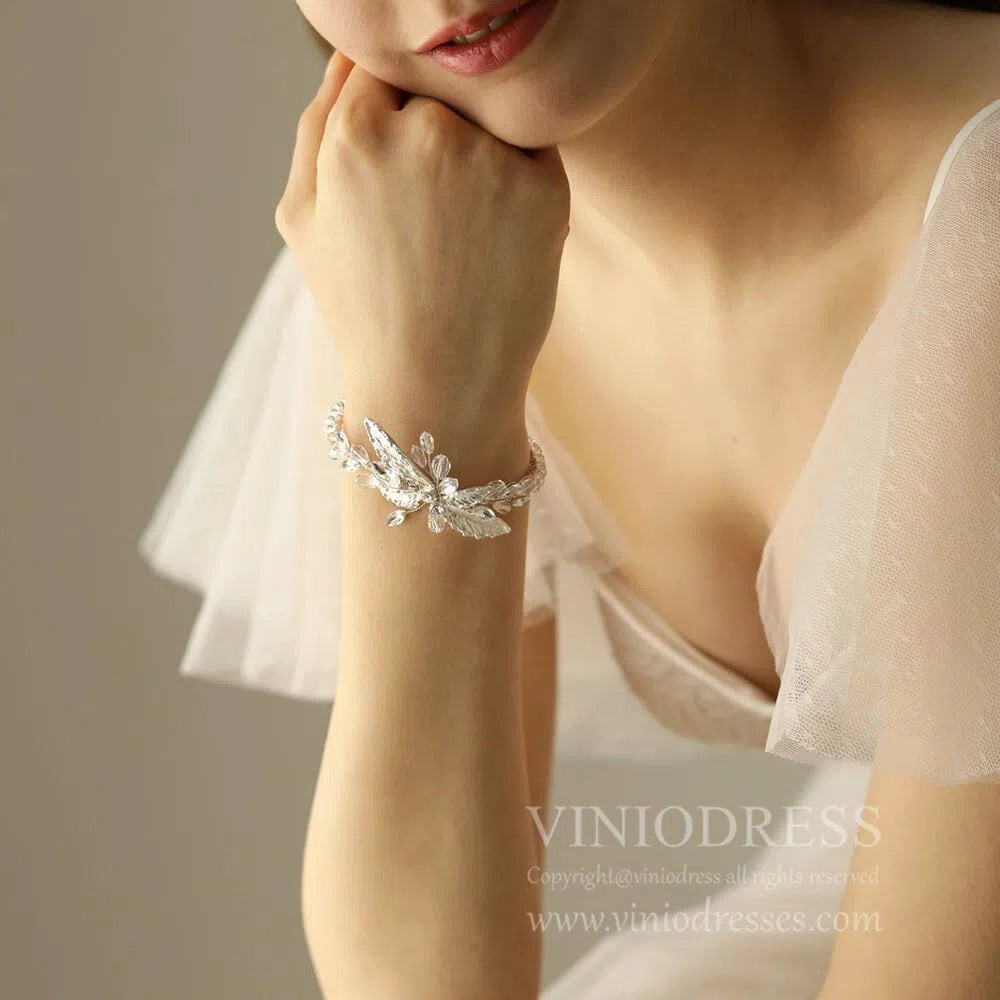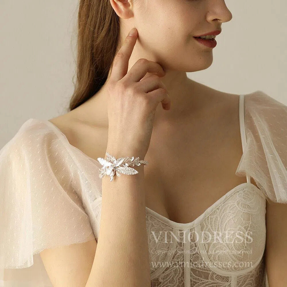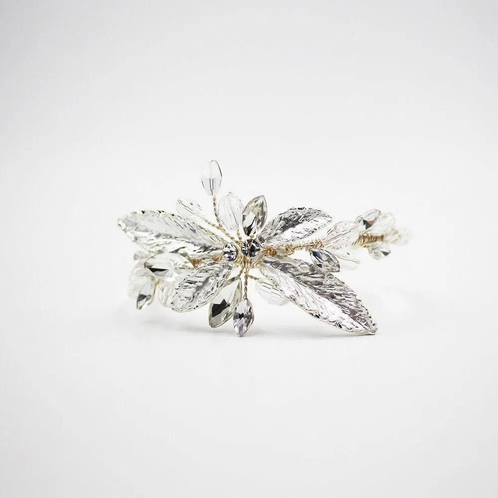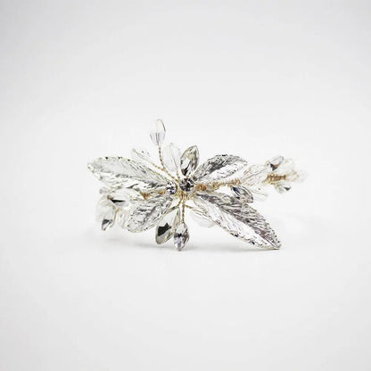 Ce joli bracelet est conçu avec des feuilles en métal argenté et des cristaux.
