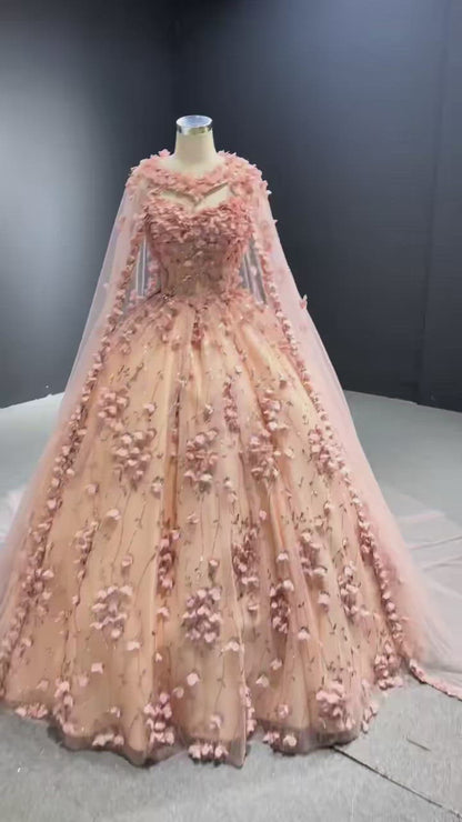 3D Flower Pink Sweet 16 Dress with Cape Vintage Ball Gown 67491
