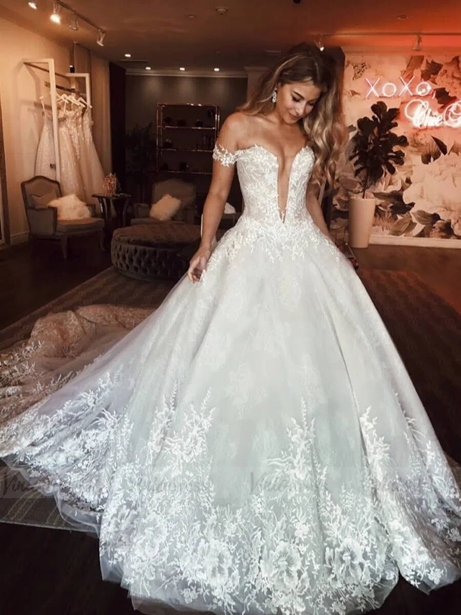 This whimsical ivory floral wedding dress enchants with soft color and romantic texture. The strapless sweetheart bodice is decorated with purple and blue embroidered flowers that flow gracefully into the layered tulle skirt. Airy tiers of tulle create movement and depth, while the chapel-length train adds an ethereal finish. Perfect for brides who dream of a floral-inspired gown with modern artistry and fairytale elegance.