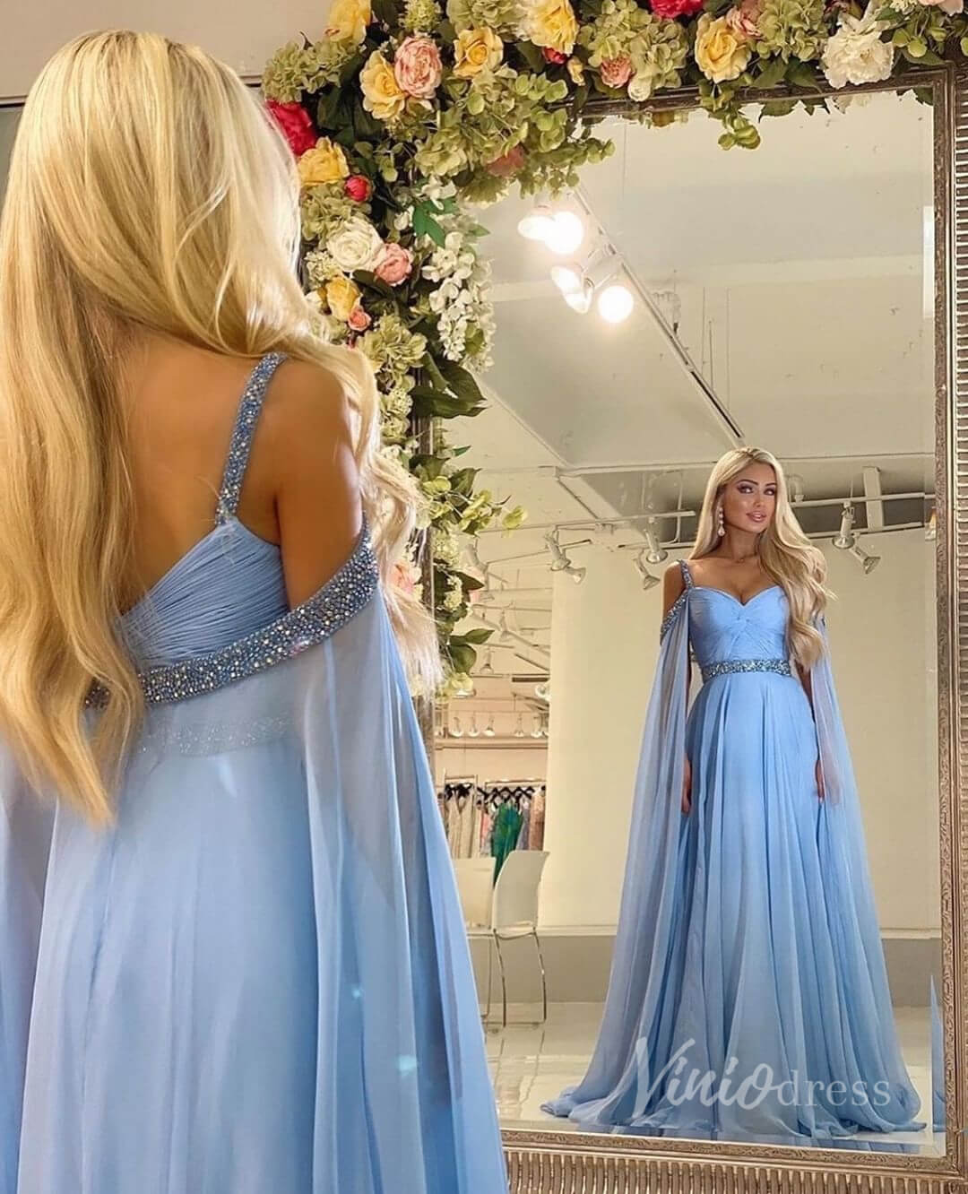 A draped beaded cape sleeve creates a graceful, regal effect, while hidden pockets bring a modern, practical touch. Perfect for prom, formal galas, or evening events, this gown blends elegance with comfort effortlessly.