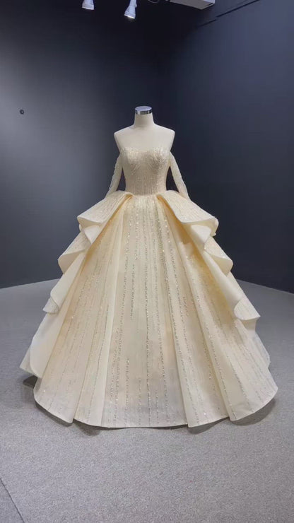 Beaded Champagne Ball Gown Wedding Dress Off Shoulder Long Sleeve 67241 Floor length