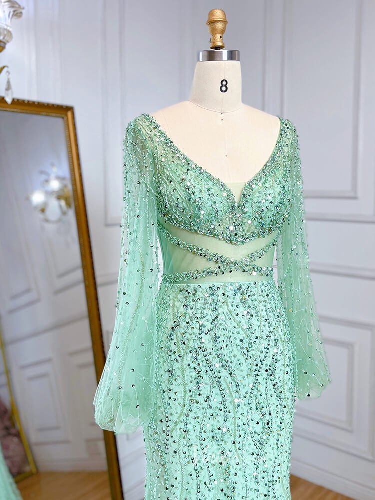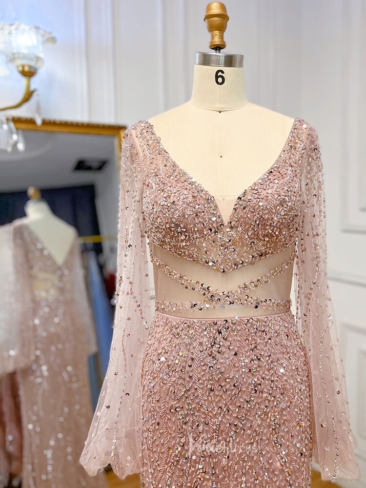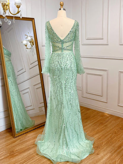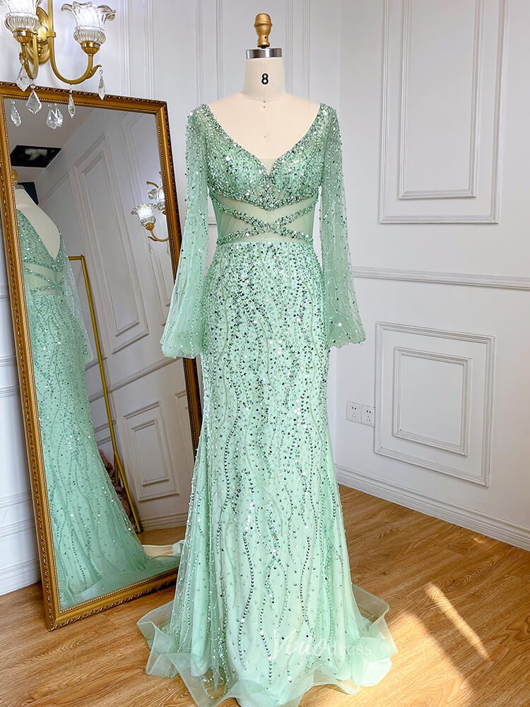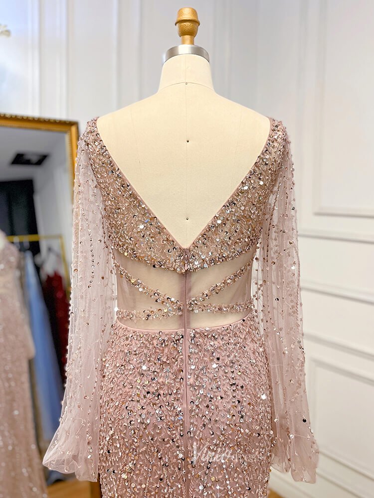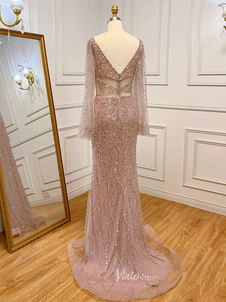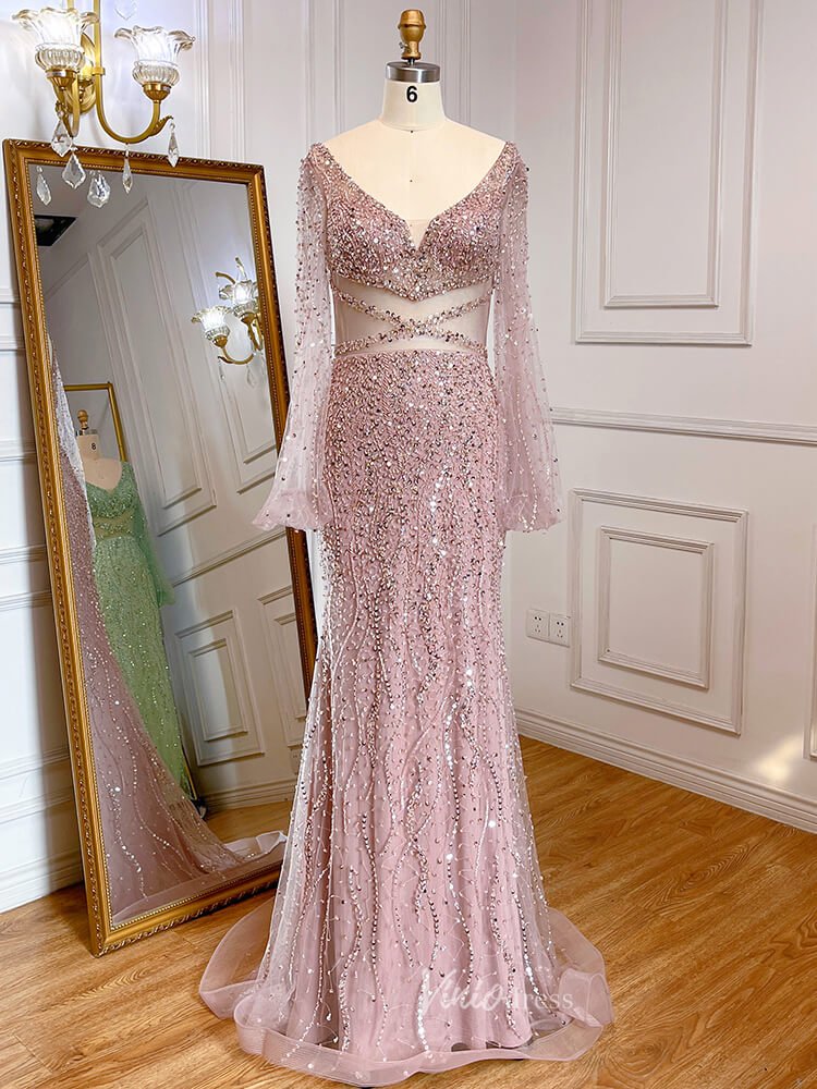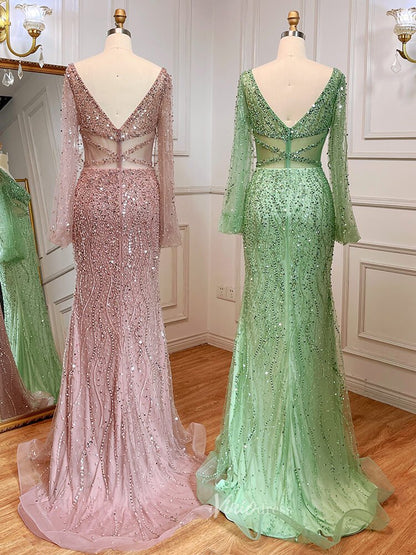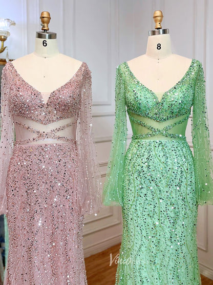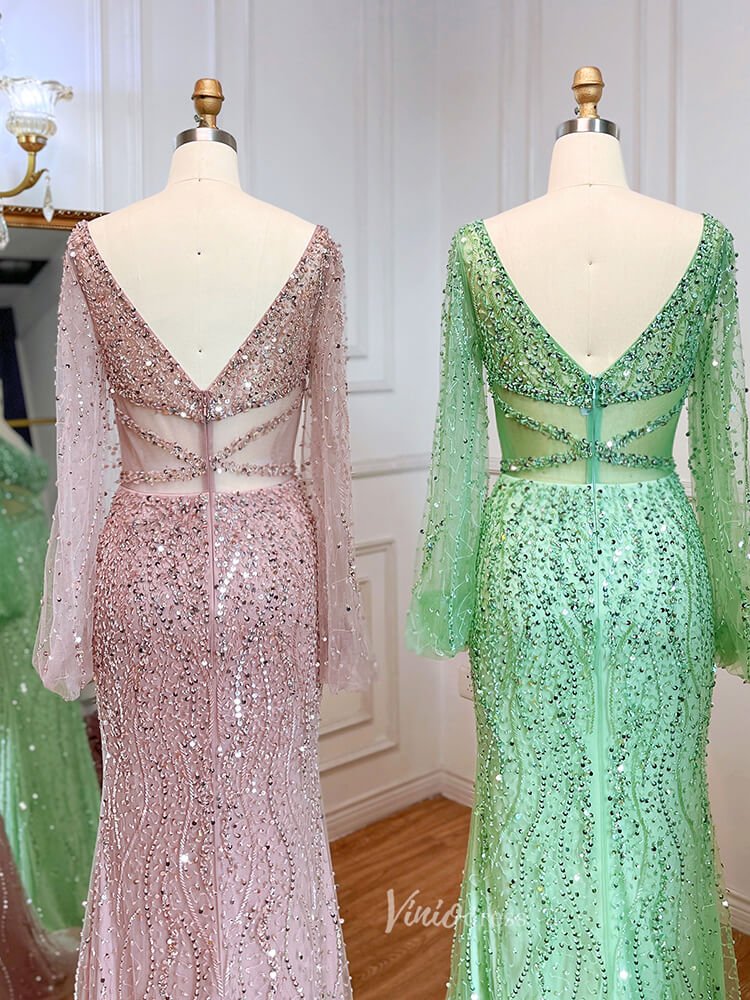 Beaded Green 1920s Evening Dresses Long Sleeve Pink Prom Dress 20046