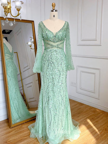 Sheath beaded formal dresses with long sleeves.