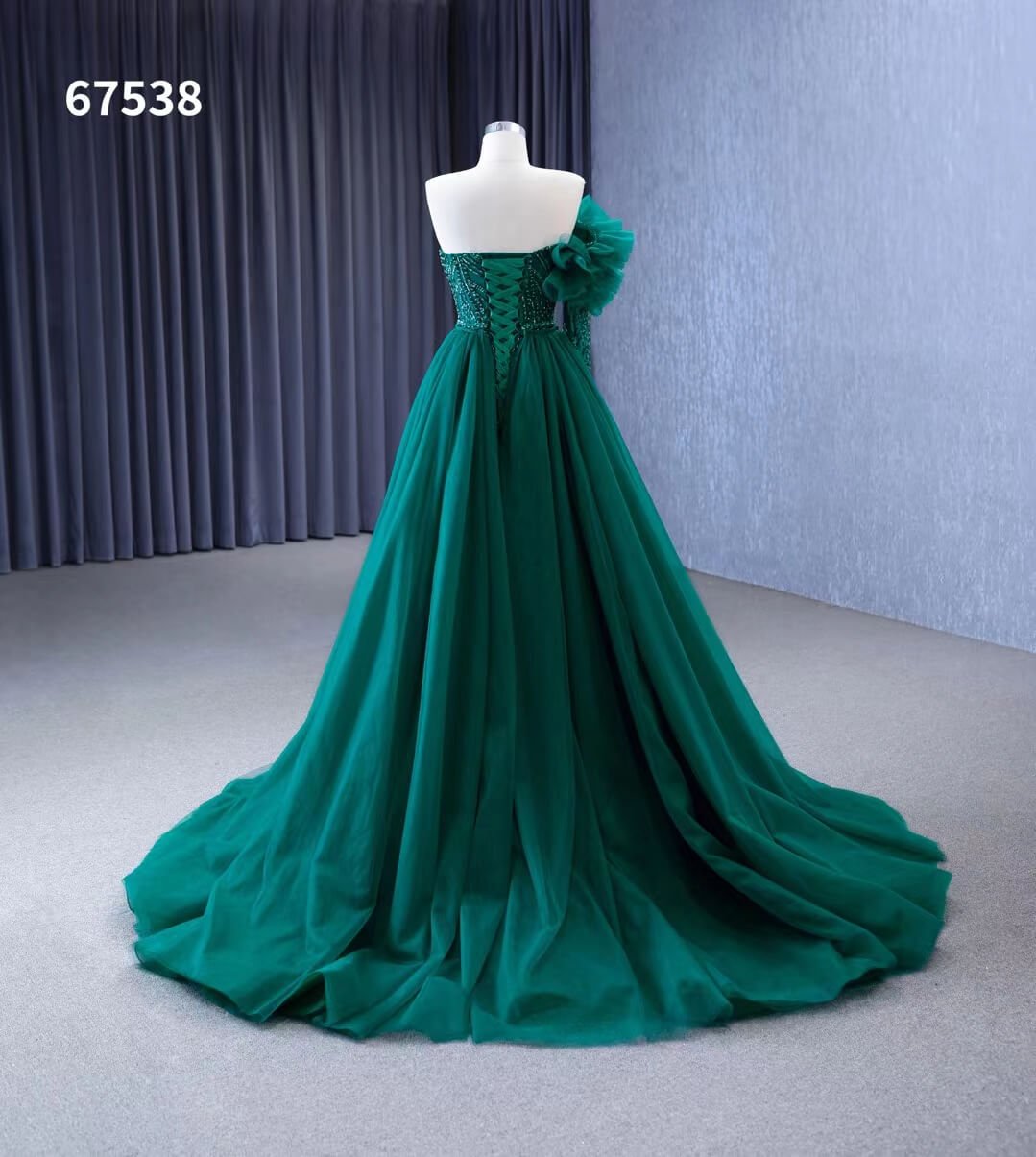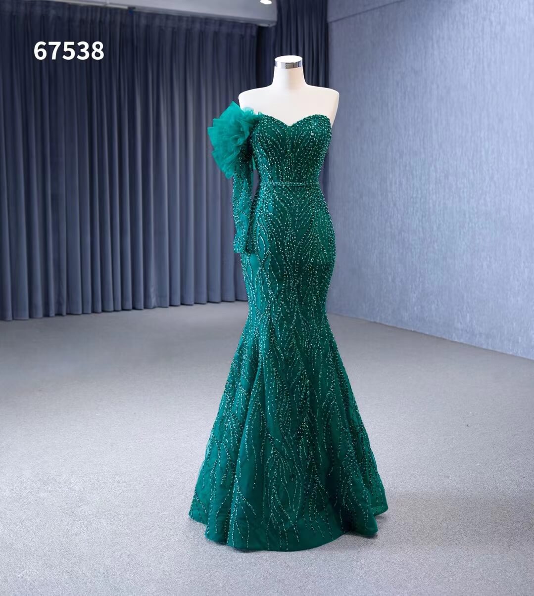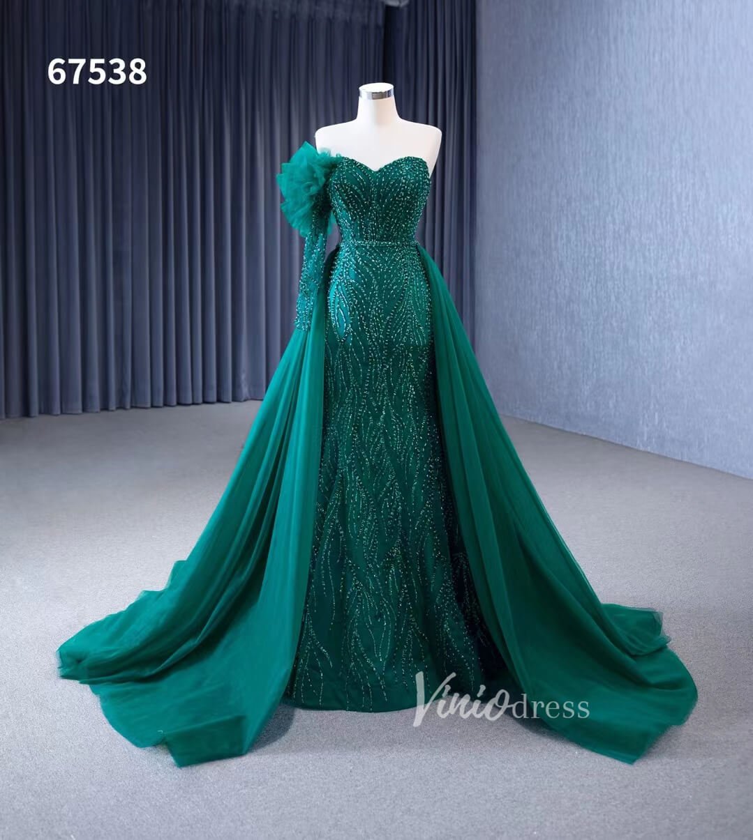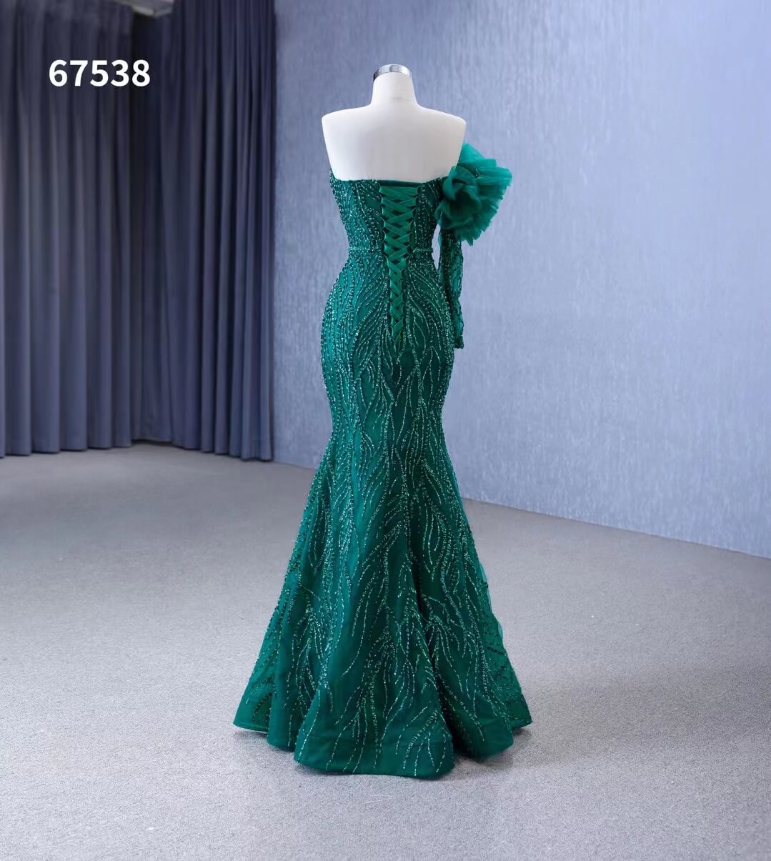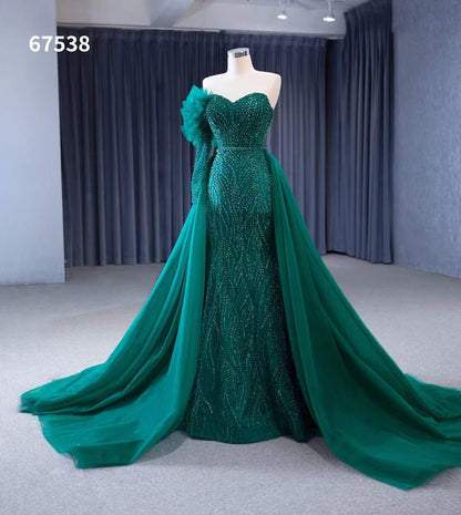 Make a stunning entrance with this exquisite beaded green mermaid wedding dress. Featuring a strapless bodice and one-shoulder neckline, the dress is further embellished with intricate full beading. A removable overskirt highlights the mermaid silhouette, giving the ensemble a touch of elegance and femininity. Perfect for the modern bride.