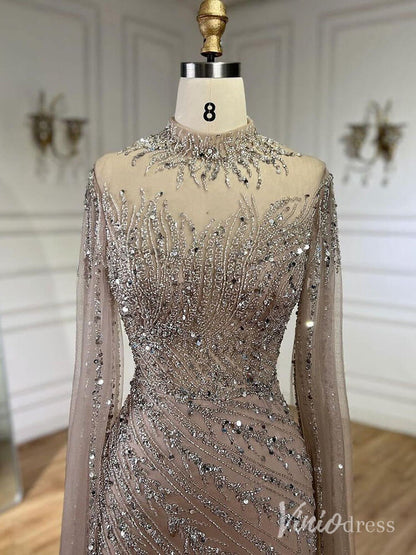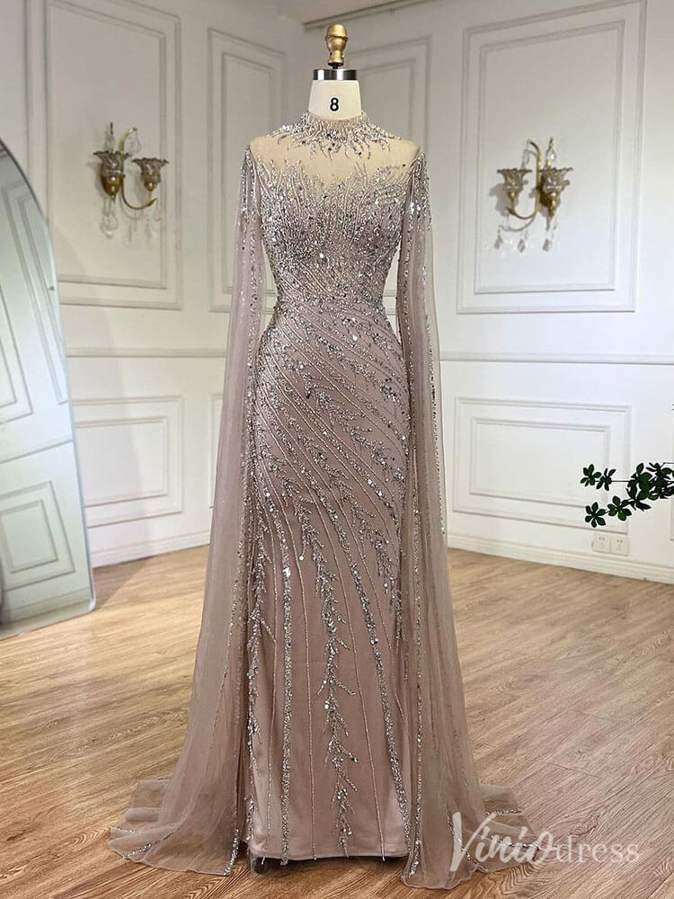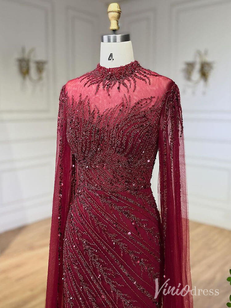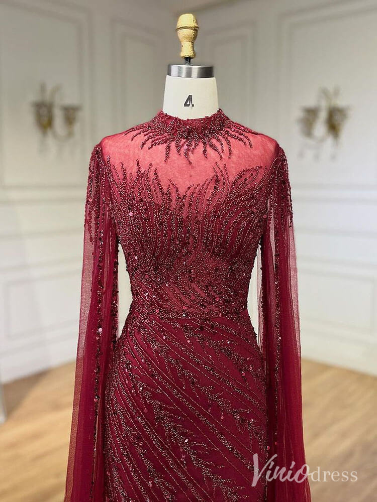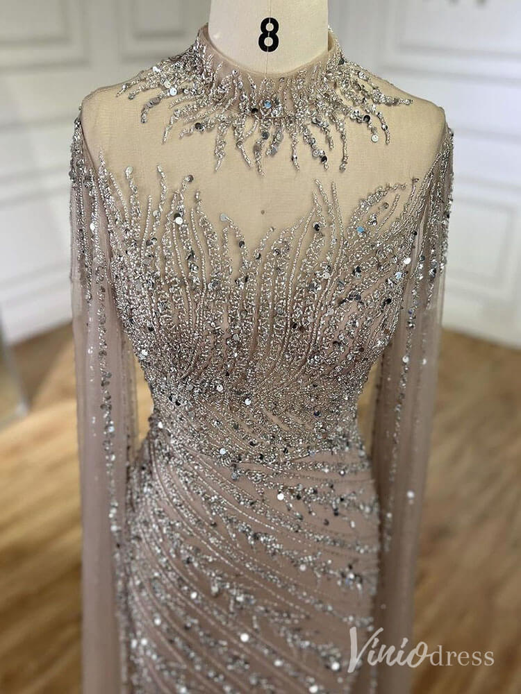 This beaded lace sheath dress features extra long sleeves and a high neck, adding elegance and sophistication to any special occasion. The intricate beading enhances the luxurious feel of this dress, making it perfect for mothers of the bride.