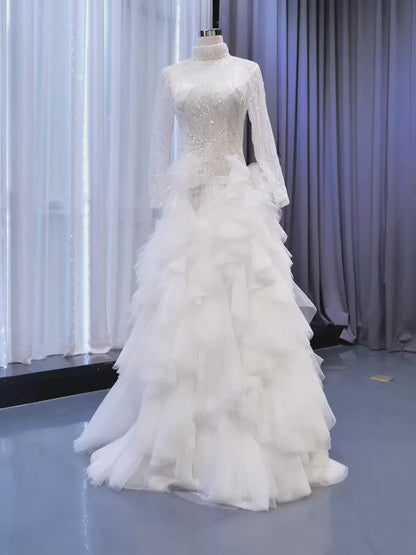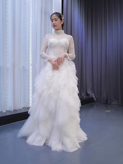 Make your fairytale wedding vision come true with this whimsical organza wedding gown, designed to capture romance in every detail. The gown features off-shoulder sleeves embellished with 3D floral appliqués, adding soft texture and dreamy volume. A structured sheer corset bodice with visible boning defines the waist while providing elegant support. The flowing A-line skirt in lightweight organza moves gracefully with every step, and the overall silhouette makes it ideal for a romantic garden or outdoor ceremony.