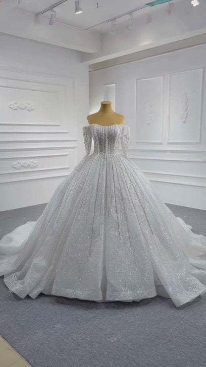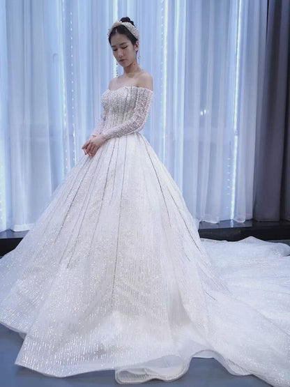 Beaded Off the Shoulder Long Sleeve Wedding Gown VW2036