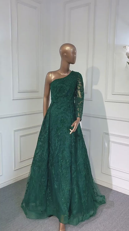 Beaded One Shoulder Formal Dresses A-Line Lace Applique Prom Dress FD3005